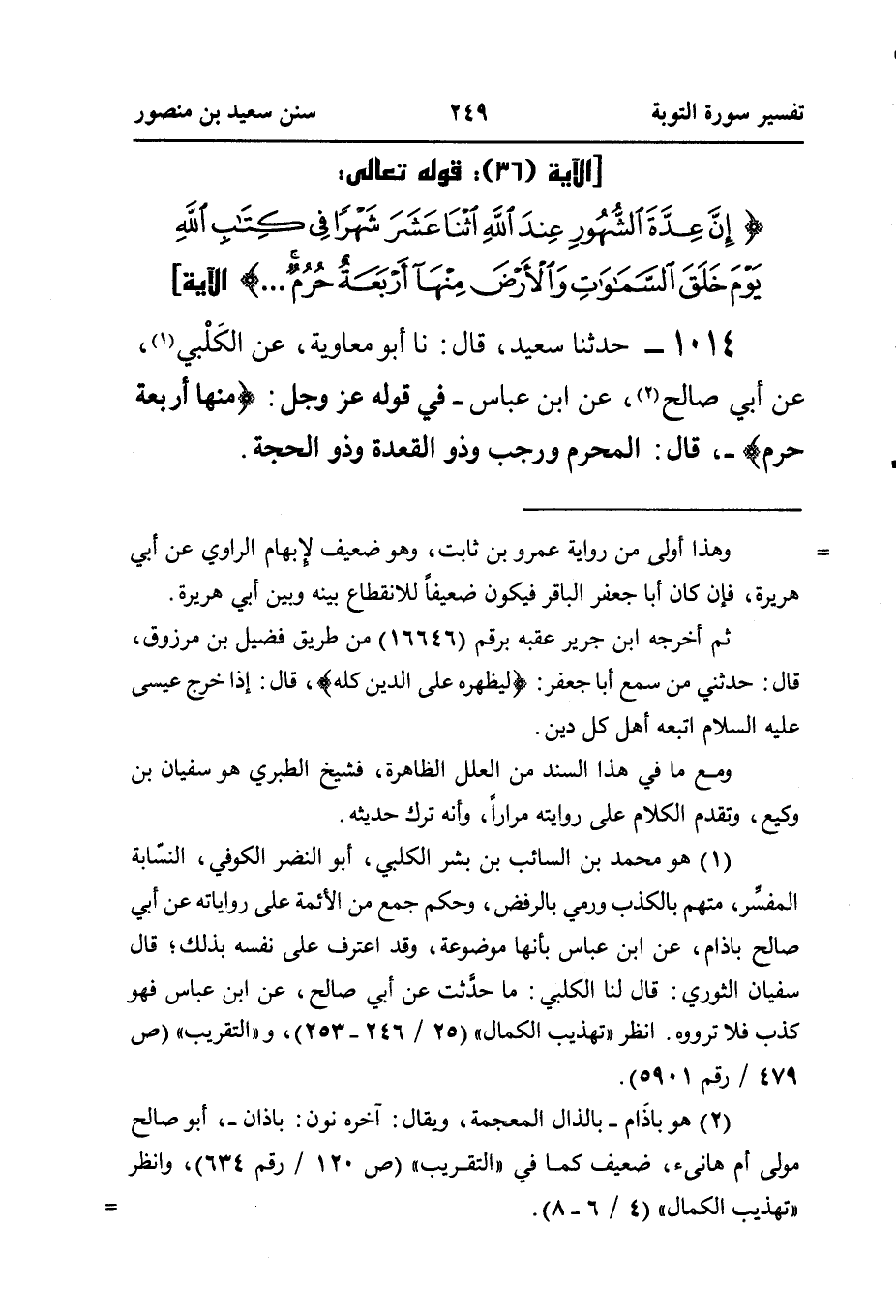 ١٠١٤ - حَدَّثَنَا سَعِيدٌ، قَالَ: نا أَبُو مُعَاوِيَةَ، عَنِ الكَلْبي (¬١)، عَنْ أَبِي صَالِحٍ (¬٢)، عَنِ ابْنِ عَبَّاسٍ - فِي قَوْلِهِ عَزَّ وَجَلَّ: {مِنْهَا أَرْبَعَةٌ حُرُمٌ} - قَالَ: الْمُحَرَّمُ وَرَجَبٌ وَذُو الْقَعْدَةِ وذو الحجة.