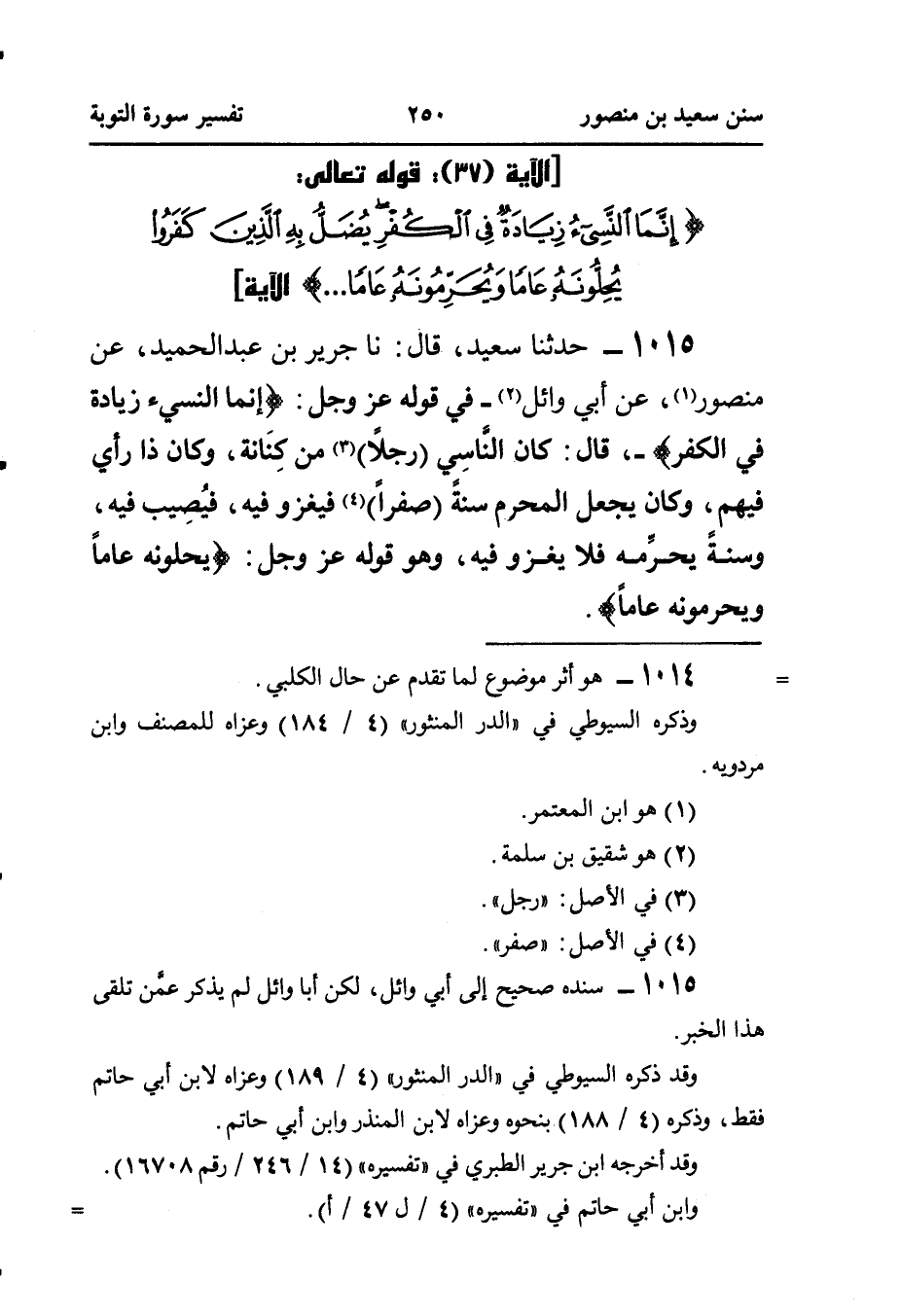 ١٠١٥ - حَدَّثَنَا سَعِيدٌ، قَالَ: نا جَرِيرُ بْنُ عَبْدِ الْحَمِيدِ، عَنْ مَنْصُورٍ (¬١)، عَنْ أَبِي وَائِلٍ (¬٢) - فِي قَوْلِهِ عَزَّ وَجَلَّ: {إِنَّمَا النَّسِيءُ زِيَادَةٌ فِي الكُفْرِ} - قَالَ: كَانَ النَّاسِي (رَجُلًا) (¬٣) مِنْ كِنَانة، وَكَانَ ذَا رَأْيٍ فِيهِمْ، وَكَانَ يَجْعَلُ الْمُحَرَّمَ سَنَةً (صَفَرًا) (¬٤) فَيَغْزُو فِيهِ، فيُصِيب فِيهِ، وَسَنَةً يحرِّمه فَلَا يَغْزُو فِيهِ، وَهُوَ قَوْلُهُ عَزَّ وَجَلَّ: {يُحِلُّونَهُ عَامًا وَيُحَرِّمُونَهُ عَامًا}.