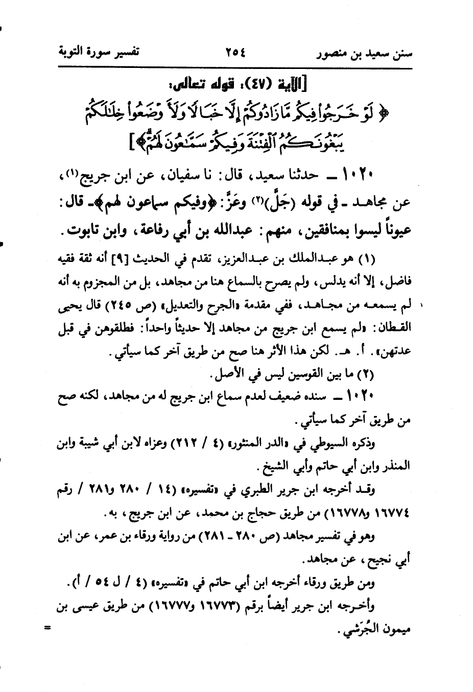 ١٠٢٠ - حَدَّثَنَا سَعِيدٌ، قَالَ: نا سُفْيَانُ، عَنِ ابْنِ جُرَيْجٍ (¬١)، عَنْ مُجَاهِدٍ - فِي قَوْلِهِ (جَلَّ) (¬٢) وعَزَّ: {وَفِيكُمْ سَمَّاعُونَ لَهُمْ} - قَالَ: عُيُونًا لَيْسُوا بِمُنَافِقِينَ، مِنْهُمْ: عَبْدُ اللَّهِ بْنُ أَبِي رِفَاعَةَ، وابن تابوت.