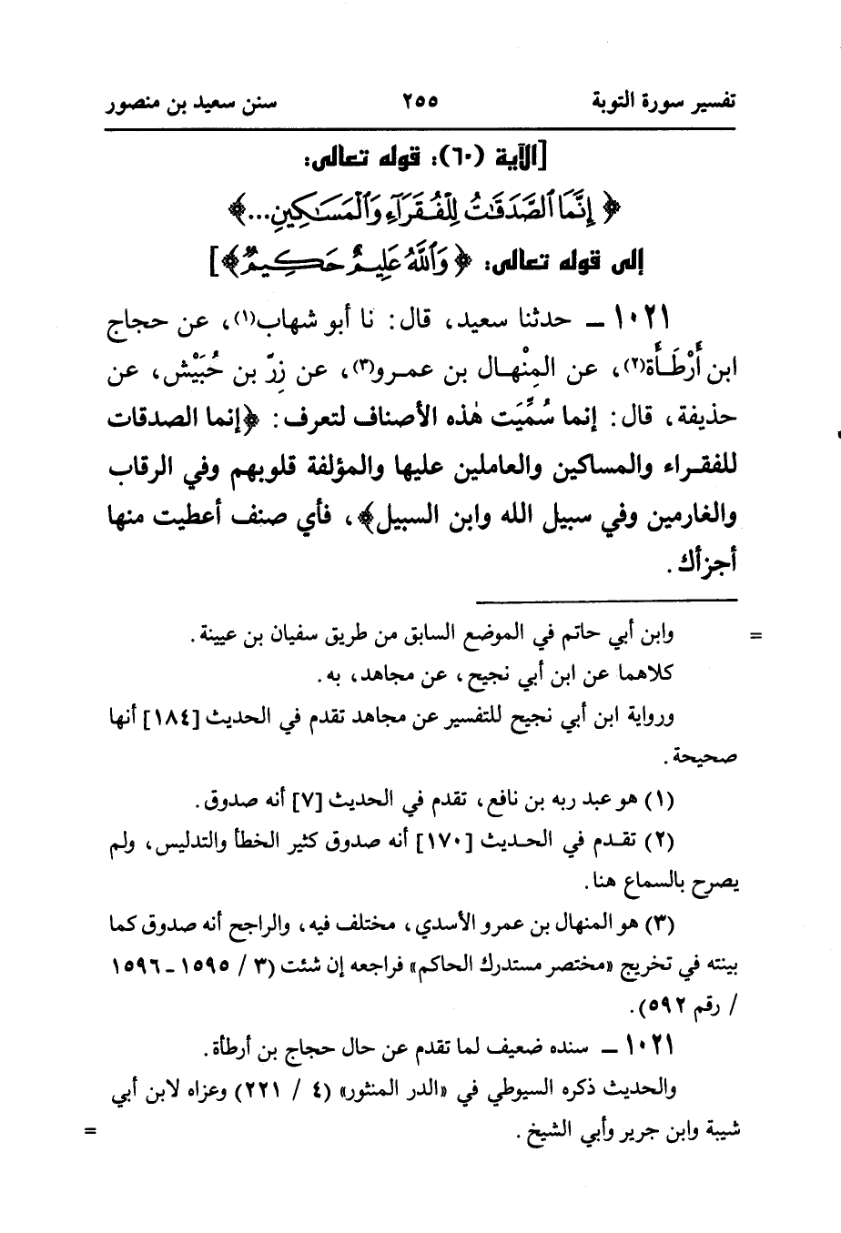 ١٠٢١ - حَدَّثَنَا سَعِيدٌ، قَالَ: نا أَبُو شِهَابٍ (¬١)، عَنْ حَجَّاجِ بْنِ أَرْطَأَة (¬٢)، عَنِ المِنْهال بْنِ عَمْرٍو (¬٣)، عَنْ زِرّ بْنِ حُبَيْش، عَنْ حُذَيْفَةَ، قَالَ: إِنَّمَا سُمِّيَت هَذِهِ الْأَصْنَافُ لِتَعْرِفَ: {إِنَّمَا الصَّدَقَاتُ لِلْفُقَرَاءِ وَالمَسَاكِينِ وَالعَامِلِينَ عَلَيْهَا وَالمُؤَلَّفَةِ قُلُوبُهُمْ وَفِي الرِّقَابِ وَالغَارِمِينَ وَفِي سَبِيلِ اللهِ وَاِبْنِ السَّبِيلِ}، فَأَيُّ صِنْفٍ أَعْطَيْتَ مِنْهَا أَجْزَأْكَ.