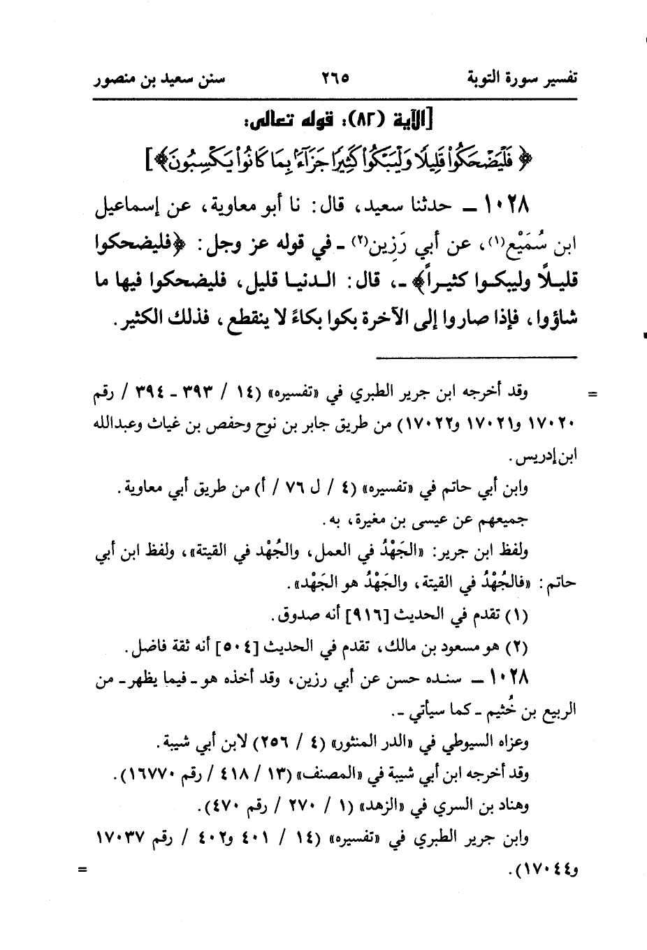 ١٠٢٨ - حَدَّثَنَا سَعِيدٌ، قَالَ: نا أَبُو مُعَاوِيَةَ، عَنْ إِسْمَاعِيلَ بْنِ سُمَيْع (¬١)، عَنْ أَبِي رَزِين (¬٢) - فِي قَوْلِهِ عَزَّ وَجَلَّ: {فَلْيَضْحَكُوا قَلِيلًا وَلْيَبْكُوا كَثِيرًا} -، قَالَ: الدُّنْيَا قَلِيلٌ، فَلْيَضْحَكُوا فِيهَا ما شاؤوا، فَإِذَا صَارُوا إِلَى الْآخِرَةِ بَكَوْا بُكَاءً لَا يَنْقَطِعُ، فَذَلِكَ الْكَثِيرُ.