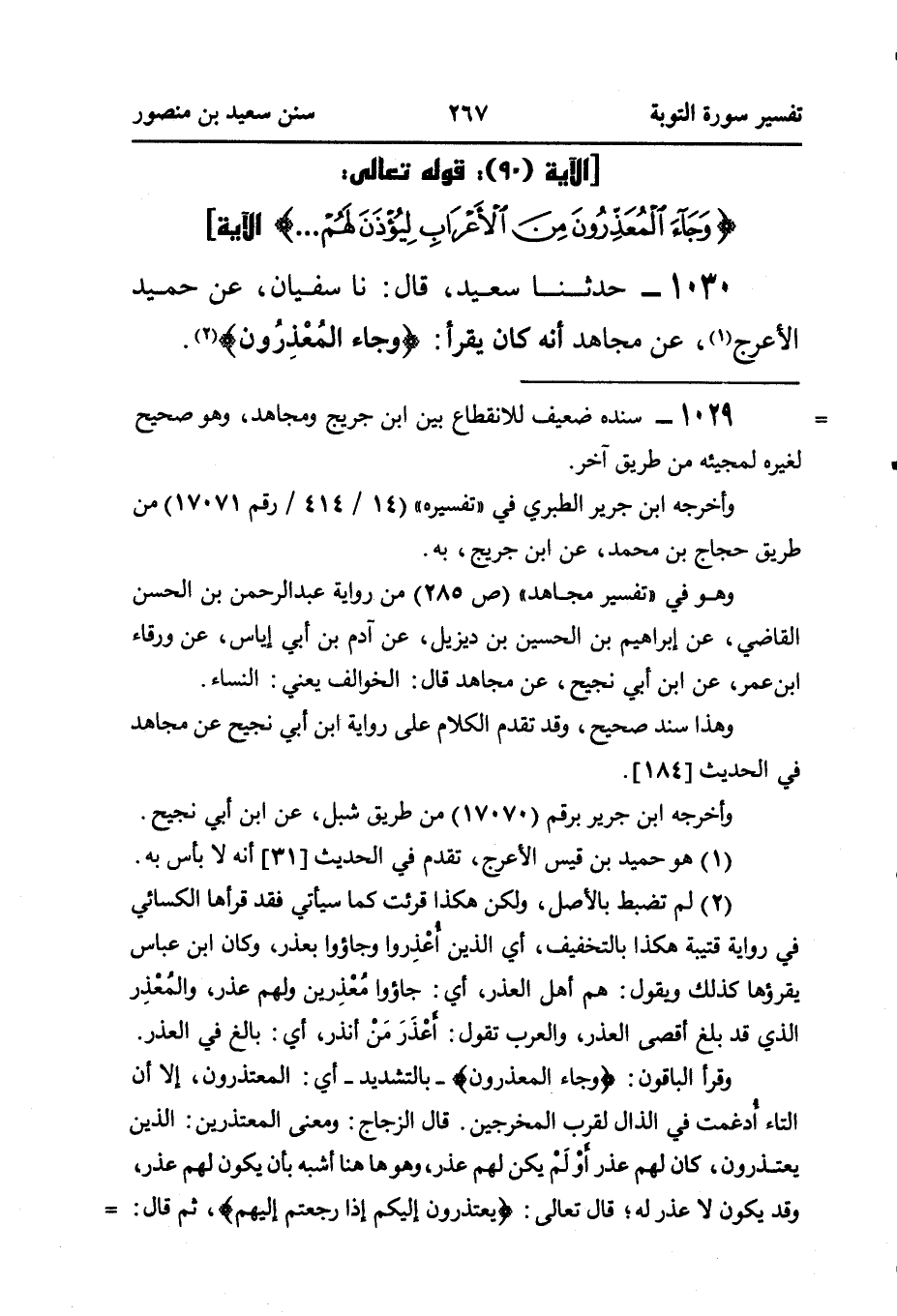 ١٠٣٠ - حَدَّثَنَا سَعِيدٌ، قَالَ: نا سُفْيَانُ، عَنْ حُمَيْدٍ الْأَعْرَجِ (¬١)، عَنْ مُجَاهِدٍ، أَنَّهُ كَانَ يَقْرَأُ: {وَجَاءَ المُعْذِرُون} (¬٢).