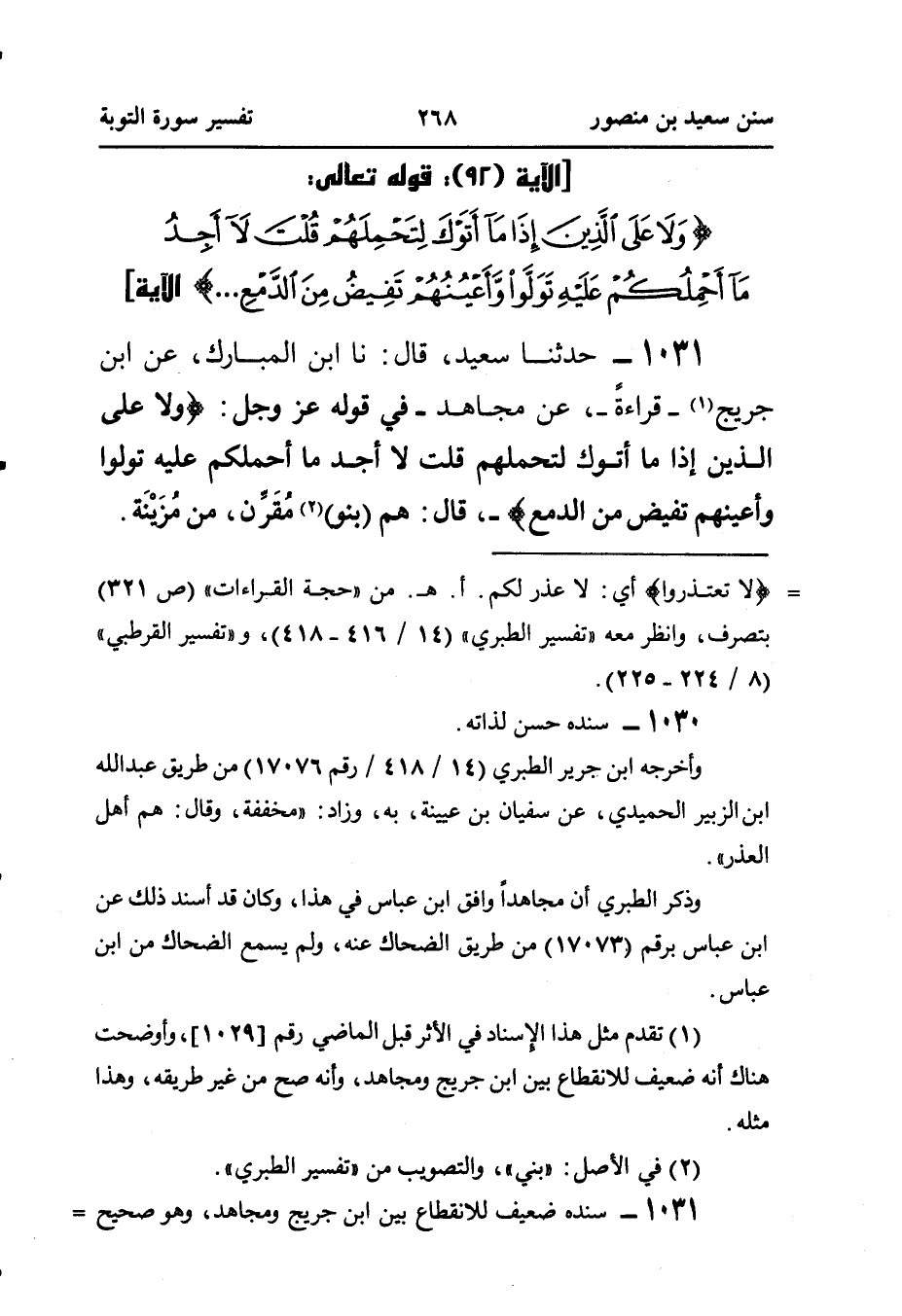 ١٠٣١ - حَدَّثَنَا سَعِيدٌ، قَالَ: نا ابْنُ الْمُبَارَكِ، عَنِ ابْنِ جُرَيْجٍ (¬١) - قِرَاءَةً - عَنْ مُجَاهِدٍ - فِي قَوْلِهِ عَزَّ وَجَلَّ: {وَلَا عَلَى الَّذِينَ إِذَا مَا أَتَوْكَ لِتَحْمِلَهُمْ قُلْتَ لَا أَجِدُ مَا أَحْمِلُكُمْ عَلَيْهِ تَوَلَّوْا وَأَعْيُنُهُمْ تَفِيضُ مِنَ الدَّمْعِ} - قَالَ: هُمْ (بَنُو) (¬٢) مُقَرِّن، مِنْ مُزَيْنَة.