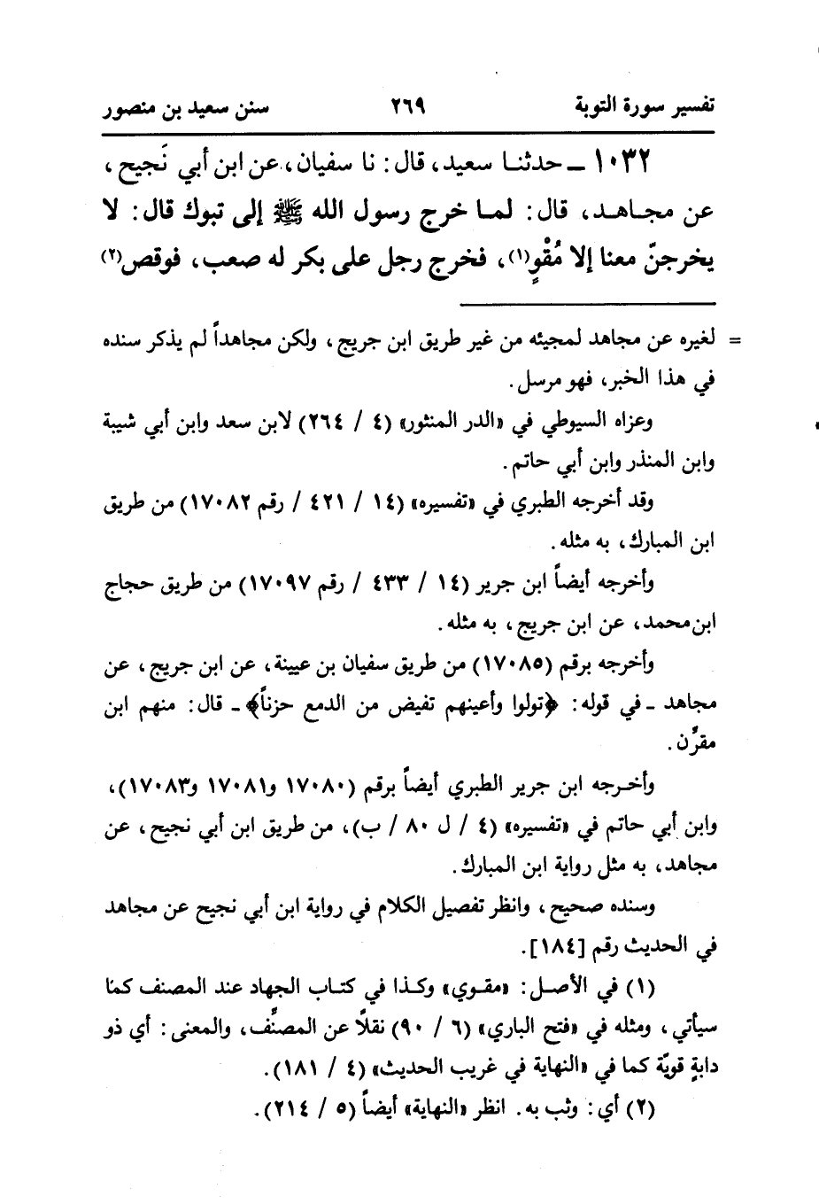 ١٠٣٢ - حَدَّثَنَا سَعِيدٌ، قَالَ: نا سُفْيَانُ، عَنِ ابْنِ أَبِي نَجيح، عَنْ مُجَاهِدٍ، قَالَ: لَمَّا خَرَجَ رَسُولُ اللَّهِ صَلَّى اللهُ عَلَيْهِ وَسَلَّمَ إِلَى تَبُوكَ، قَالَ: لَا يَخْرُجَنَّ مَعَنَا إِلَّا مُقْوٍ (¬١)، فَخَرَجَ رَجُلٌ عَلَى بَكْرٍ لَهُ صَعْبٌ، فَوُقِصَ (¬٢)