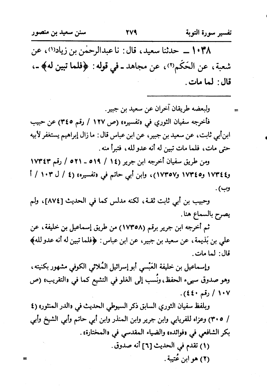 ١٠٣٨ - حَدَّثَنَا سَعِيدٌ، قَالَ: نا عَبْدُ الرَّحْمَنِ بْنُ زِيَادٍ (¬١)، عَنْ شُعْبَةَ، عَنِ الحَكَم (¬٢)، عَنْ مُجَاهِدٍ - فِي قوله: {فَلَمَّا تَبَيَّنَ لَهُ} - قال: لما مات.