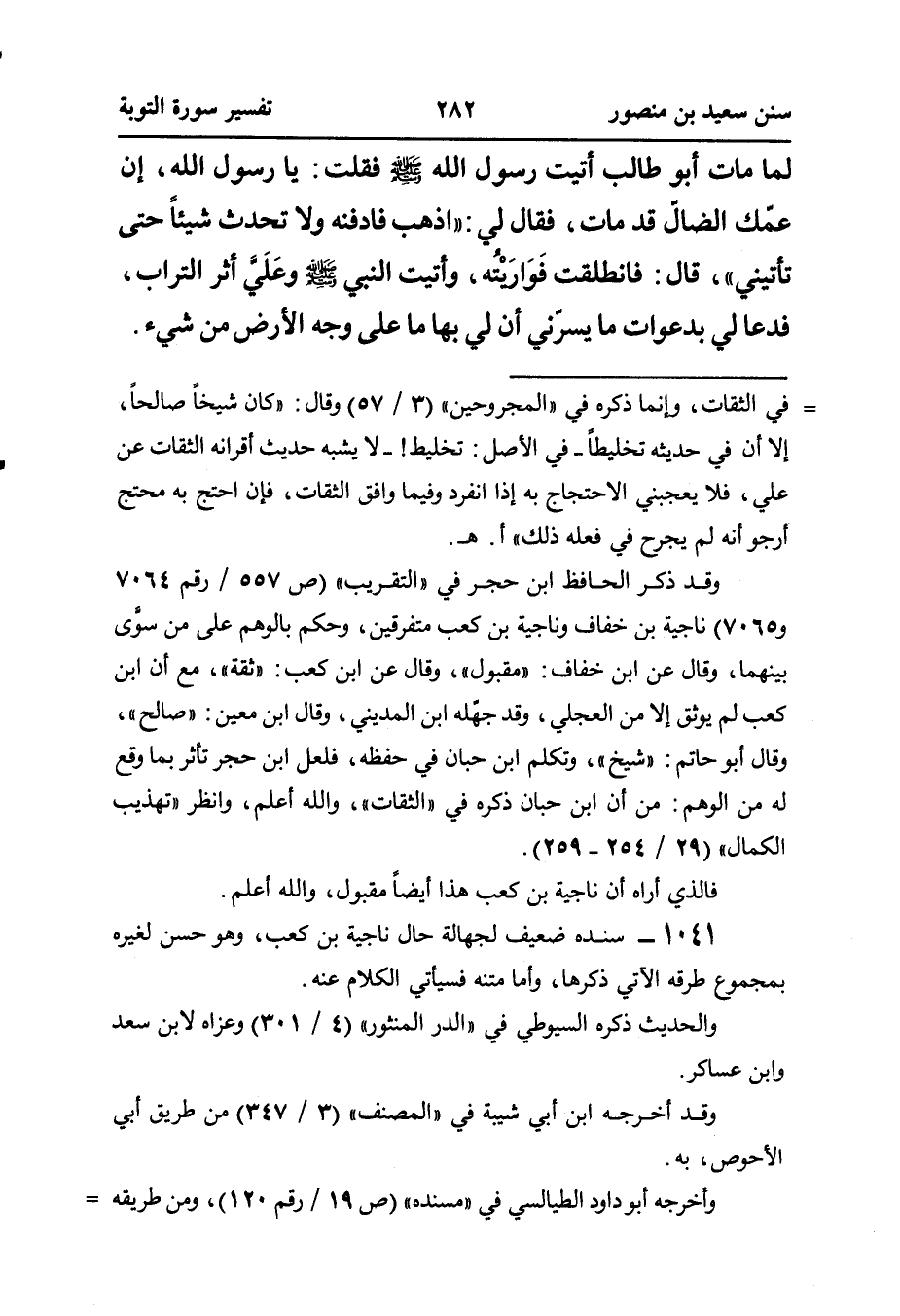 لَمَّا مَاتَ أَبُو طَالِبٍ، أَتَيْتُ رَسُولُ اللَّهِ صَلَّى اللهُ عَلَيْهِ وَسَلَّمَ فَقُلْتُ: يَا رَسُولَ اللَّهِ، إِنَّ عَمَّكَ الضَّالَّ قَدْ مَاتَ، فَقَالَ لِي: ((اذْهَبْ فَادْفِنْهُ وَلَا تُحْدِثْ شَيْئًا حَتَّى تَأْتِيَنِي)) ، قَالَ: فَانْطَلَقْتُ فَوَارَيْتُه، وَأَتَيْتُ النَّبِيَّ صَلَّى اللهُ عَلَيْهِ وَسَلَّمَ وعَلَيَّ أَثَرُ التُّرَابِ، فَدَعَا لِي بِدَعَوَاتٍ مَا يَسُرُّنِي أَنَّ لِيَ بِهَا مَا عَلَى وَجْهِ الْأَرْضِ مِنْ شَيْءٍ.