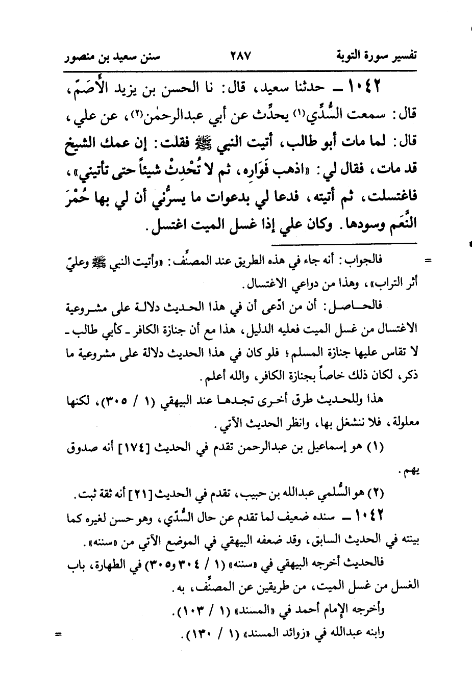١٠٤٢ - حَدَّثَنَا سَعِيدٌ، قَالَ: نا الْحَسَنُ بْنُ يَزِيدَ الأَصَمّ، قَالَ: سَمِعْتُ السُّدِّي (¬١) يحدِّث عَنْ أَبِي عَبْدِ الرَّحْمَنِ (¬٢)، عَنْ عَلِيٍّ، قَالَ: لَمَّا مَاتَ أَبُو طَالِبٍ، أَتَيْتُ النَّبِيَّ صَلَّى اللهُ عَلَيْهِ وَسَلَّمَ فَقُلْتُ: إِنَّ عَمَّكَ الشَّيْخَ قَدْ مَاتَ، فَقَالَ لِي: ((اذْهَبْ فَوَارِه، ثُمَّ لَا تُحْدِثْ شَيْئًا حَتَّى تَأْتِيَنِي))، فَاغْتَسَلْتُ، ثُمَّ أَتَيْتُهُ، فَدَعَا لِي بِدَعَوَاتٍ مَا يسرُّني أَنَّ لِيَ بِهَا حُمْرَ النَّعَم وَسُودَهَا. وَكَانَ عَلِيٌّ إِذَا غَسَّلَ الْمَيِّتَ اغْتَسَلَ.