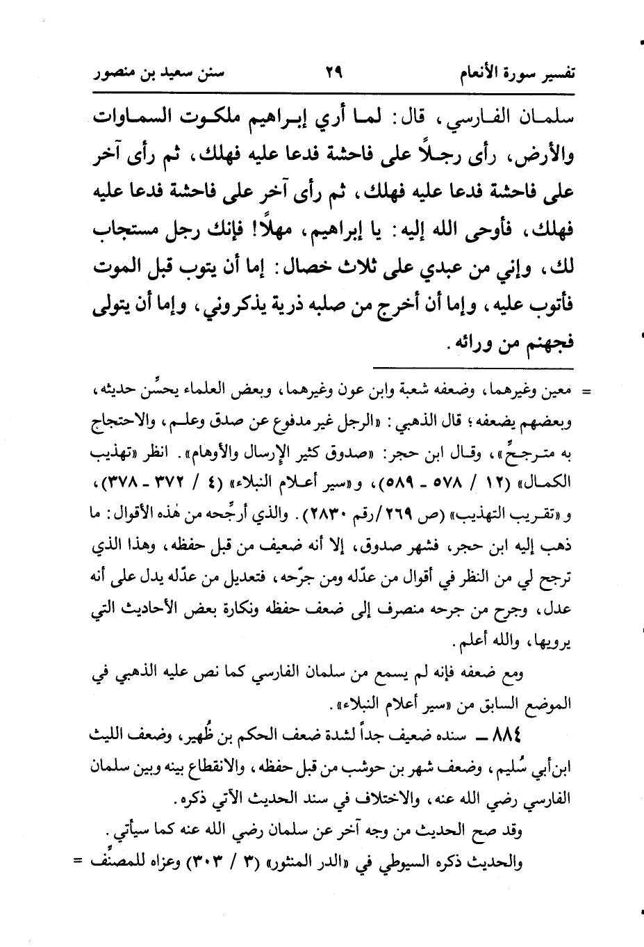 سَلْمَانَ الْفَارِسِيِّ، قَالَ: لَمَّا أُرِيَ إبراهيم ملكوت السماوات وَالْأَرْضِ، رَأَى رَجُلًا عَلَى فَاحِشَةً فَدَعَا عَلَيْهِ فَهَلَكَ، ثُمَّ رَأَى آخَرَ عَلَى فَاحِشَةٍ فَدَعَا عَلَيْهِ فَهَلَكَ، ثُمَّ رَأَى آخَرَ عَلَى فَاحِشَةٍ فَدَعَا عَلَيْهِ فَهَلَكَ، فَأَوْحَى اللَّهُ إِلَيْهِ: يَا إِبْرَاهِيمُ، مَهْلًا! فَإِنَّكَ رَجُلٌ مُسْتَجَابٌ لَكَ، وَإِنِّي مِنْ عَبْدِي عَلَى ثَلَاثِ خِصَالٍ: إِمَّا أَنْ يَتُوبَ قَبْلَ الْمَوْتِ فَأَتُوبَ عَلَيْهِ، وَإِمَّا أَنْ أُخْرِجَ مِنْ صُلْبِهِ ذُرِّيَّةً يَذْكُرُونِي، وَإِمَّا أَنْ يَتَوَلَّى فَجَهَنَّمُ مِنْ وَرَائِهِ.