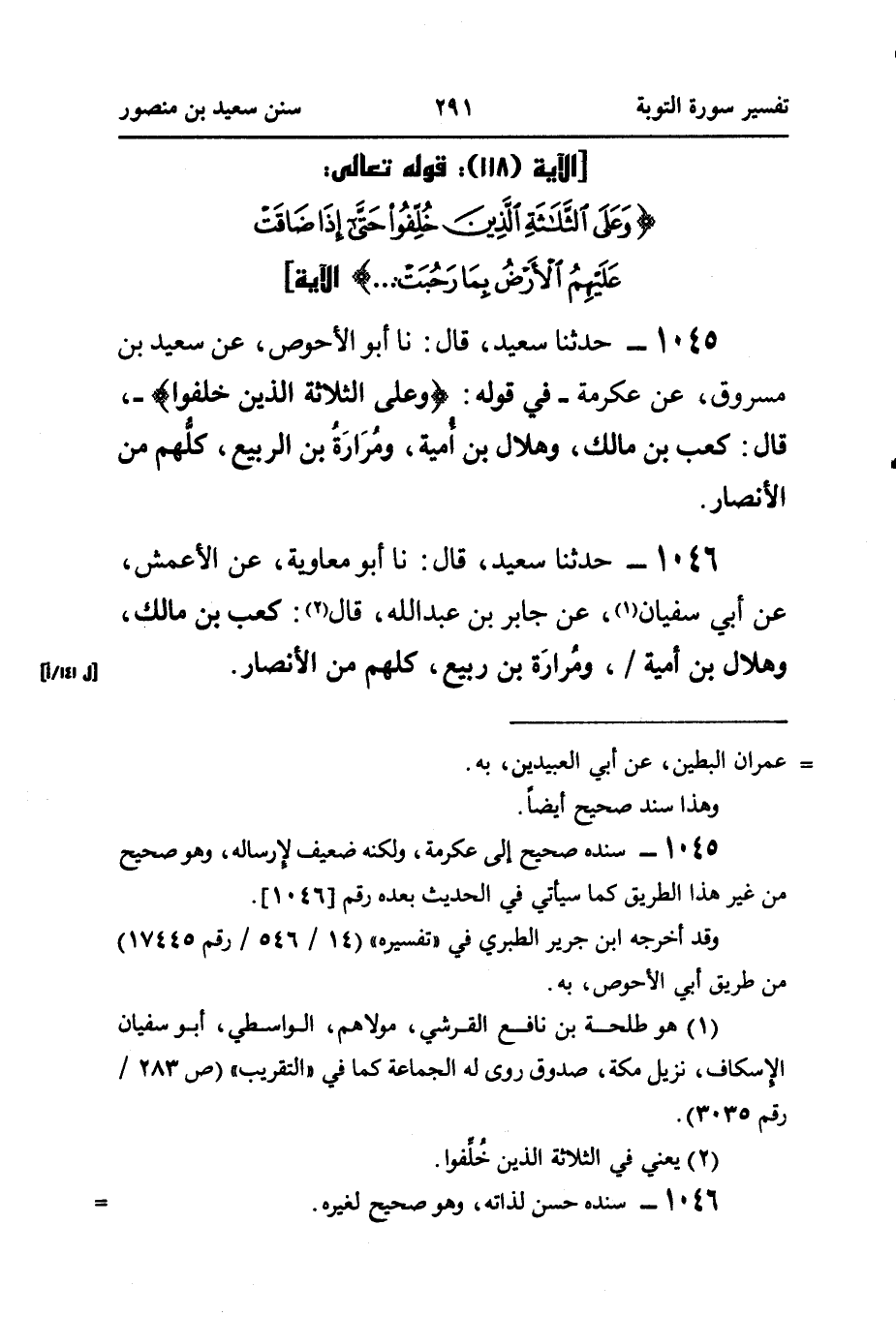 ١٠٤٥ - حَدَّثَنَا سَعِيدٌ، قَالَ: نا أَبُو الْأَحْوَصِ، عَنْ سَعِيدِ بْنِ مَسْرُوقٍ، عَنْ عِكْرِمَةَ - فِي قَوْلِهِ {وَعَلَى الثَّلَاثَةِ الَّذِينَ خُلِّفُوا} - قَالَ: كَعْبُ بْنُ مَالِكٍ، وَهِلَالُ بْنُ أُمية، ومُرَارَةُ بْنُ الرَّبِيعِ، كلُّهم مِنَ الْأَنْصَارِ.