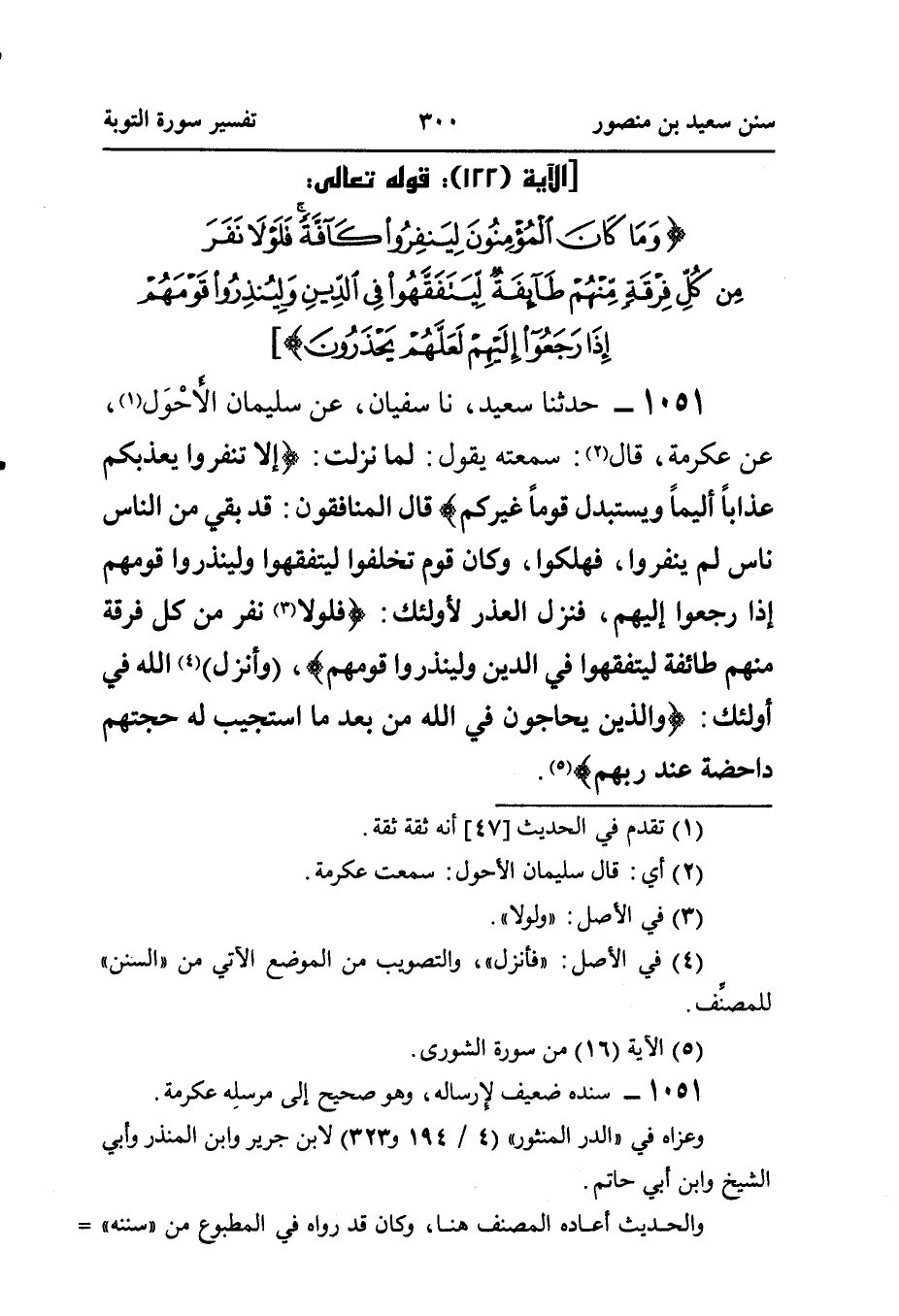 ١٠٥١ - حَدَّثَنَا سَعِيدٌ، قَالَ: نا سُفْيَانُ، عَنْ سُلَيْمَانَ الأَحْوَل (¬١)، عَنْ عِكْرِمَةَ، قَالَ (¬٢): سَمِعْتُهُ، يَقُولُ: لَمَّا نَزَلَتْ: {إِلَّا تَنْفِرُوا يُعَذِّبْكُمْ عَذَابًا أَلِيمًا وَيَسْتَبْدِلْ قَوْمًا غَيْرَكُمْ} قَالَ الْمُنَافِقُونَ: قَدْ بَقِيَ مِنَ النَّاسِ نَاسٌ لَمْ يَنْفِرُوا، فَهَلَكُوا، وَكَانَ قَوْمٌ تَخَلَّفُوا لِيَتَفَقَّهُوا وَلْيُنْذِرُوا قَوْمَهُمْ إِذَا رَجَعُوا إِلَيْهِمْ، فَنَزَلَ الْعُذْرُ لِأُولَئِكَ: {فَلَوْلَا (¬٣) نَفَرَ مِنْ كُلِّ فِرْقَةٍ مِنْهُمْ طَائِفَةٌ لِيَتَفَقَّهُوا فِي الدِّينِ وَلِيُنْذِرُوا قَوْمَهُمْ} و (أنزل) (¬٤) اللَّهُ فِي أُولَئِكَ: {وَالَّذِينَ يُحَاجُّونَ فِي اللهِ مِنْ بَعْدِ مَا اسْتُجِيبَ لَهُ حُجَّتُهُمْ دَاحِضَةٌ عِنْدَ رَبِّهِمْ} (¬٥).