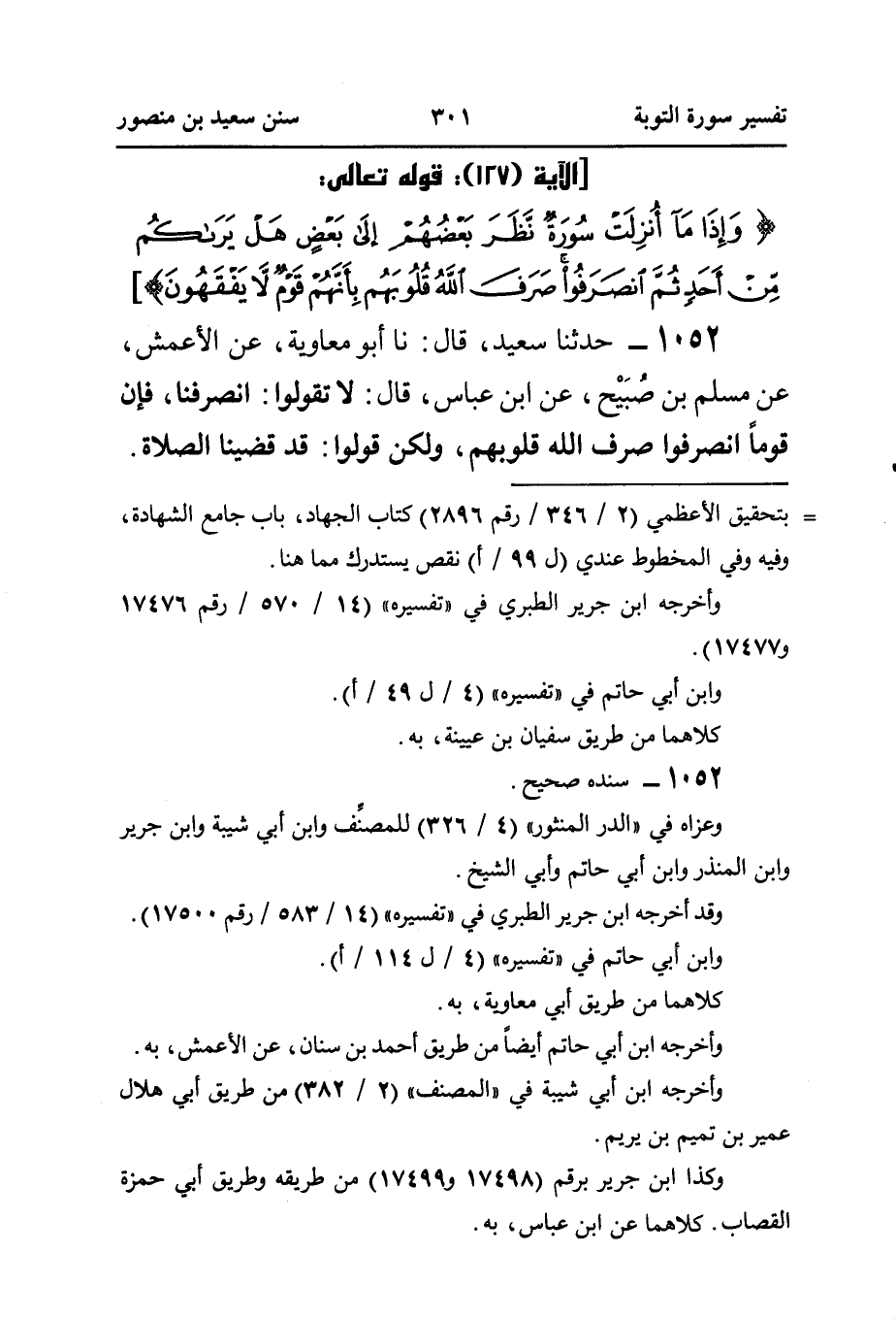١٠٥٢- حَدَّثَنَا سَعِيدٌ، قَالَ: نا أَبُو مُعَاوِيَةَ، عَنِ الْأَعْمَشِ، عَنْ مُسْلِمِ بْنِ صُبَيْح، عَنِ ابْنِ عَبَّاسٍ، قَالَ: لَا تَقُولُوا: انْصَرَفْنَا، فَإِنَّ قَوْمًا انْصَرَفُوا صَرَفَ اللَّهُ قُلُوبَهُمْ، وَلَكِنْ قُولُوا: قَدْ قَضَيْنَا الصَّلَاةَ.