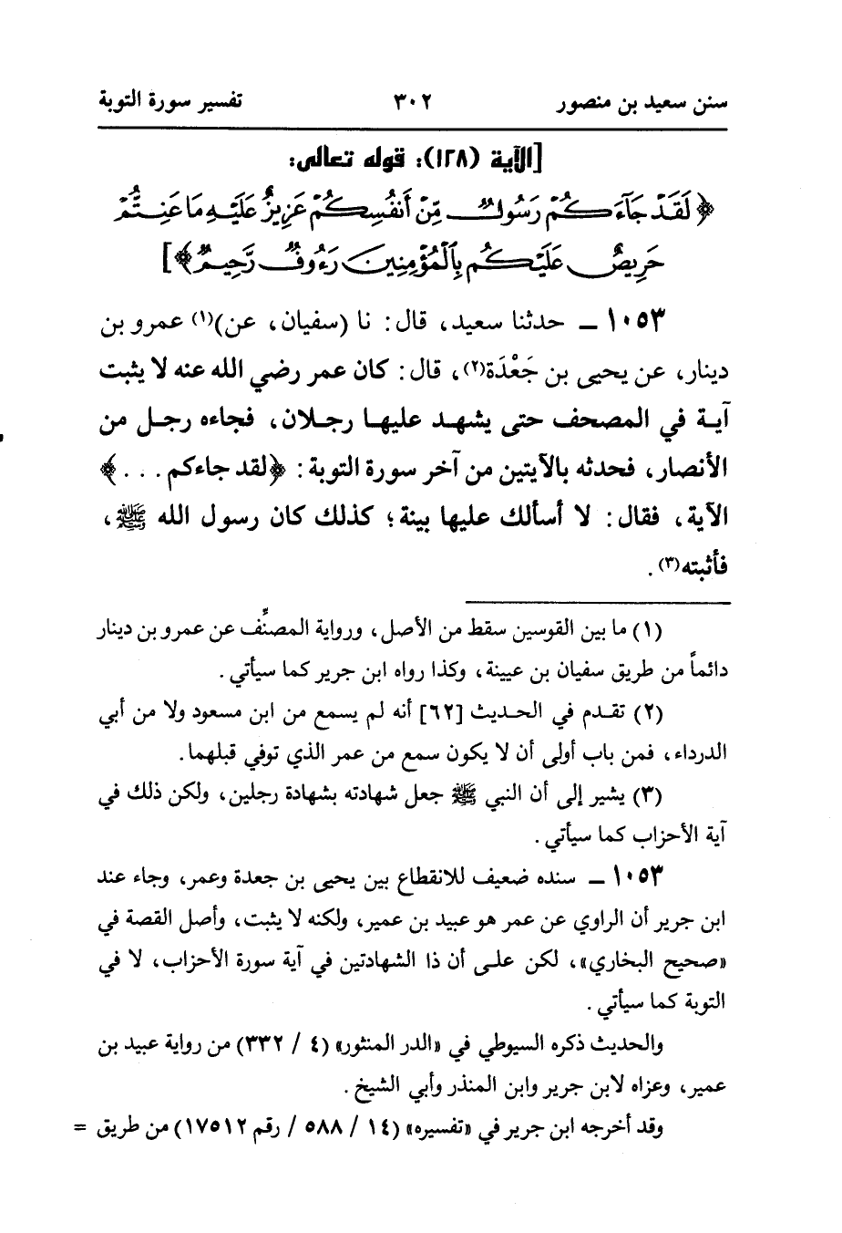 ١٠٥٣ - حَدَّثَنَا سَعِيدٌ، قَالَ: نا (سُفْيَانُ، عَنْ) (¬١) عَمْرِو بْنِ دِينَارٍ، عَنْ يَحْيَى بْنِ جَعْدَة (¬٢)، قَالَ: كَانَ عُمَرُ رَضِيَ اللَّهُ عَنْهُ لَا يُثْبِتُ آيَةً فِي الْمُصْحَفِ حَتَّى يَشْهَدَ عَلَيْهَا رَجُلَانِ، فَجَاءَهُ رَجُلٌ مِنَ الْأَنْصَارِ، فَحَدَّثَهُ بِالْآيَتَيْنِ مِنْ آخِرِ سُورَةِ التَّوْبَةِ: {لَقَدْ جَاءَكُمْ ... } الْآيَةَ، فَقَالَ: لَا أَسْأَلُكَ عَلَيْهَا بَيِّنَةً، كَذَلِكَ كَانَ رَسُولُ اللَّهِ صَلَّى اللهُ عَلَيْهِ وَسَلَّمَ فَأَثْبَتَهُ (¬٣).