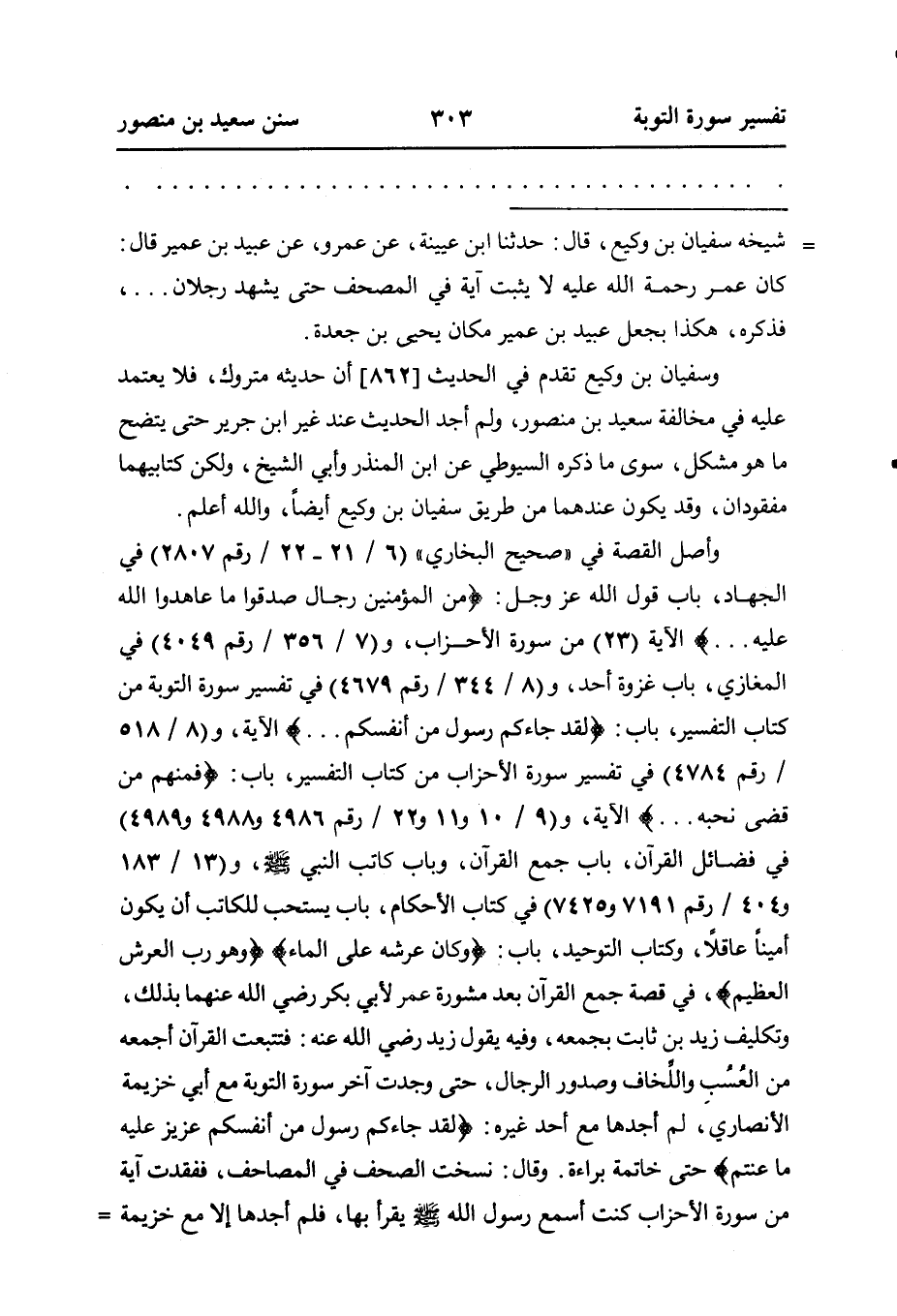 وأصل القصة في ((صحيح البخاري)) (٦ / ٢١ - ٢٢ / رقم ٢٨٠٧) في الجهاد، باب قول الله عز وجل: {من المؤمنين رجال صدقوا ما عاهدوا الله عليه ... } الآية (٢٣) من سورة الأحزاب، و (٧ / ٣٥٦ / رقم ٤٠٤٩) في المغازي، باب غزوة أحد، و (٨ / ٣٤٤ / رقم ٤٦٧٩) في تفسير سورة التوبة من كتاب التفسير، باب: {لَقَدْ جَاءَكُمْ رَسُولٌ مِنْ أَنْفُسِكُمْ ... } الآية، و (٨ / ٥١٨ / رقم ٤٧٨٤) في تفسير سورة الأحزاب من كتاب التفسير، باب: {فمنهم من قضى نحبه ... } الآية، و (٩ / ١٠ و ١١ و ٢٢ / رقم ٤٩٨٦ و ٤٩٨٨ و ٤٩٨٩) في فضائل القرآن، باب جمع القرآن، وباب كاتب النَّبِيِّ صَلَّى اللهُ عَلَيْهِ وَسَلَّمَ، و (١٣ / ١٨٣ و ٤٠٤/ رقم ٧١٩١ و ٧٤٢٥) في كتاب الأحكام، باب يستحب للكاتب أن يكون أمينًا عاقلاً، وكتاب التوحيد، باب: {وكان عرشه على الماء} {وهو رب العرش العظيم} ، في قصة جمع القرآن بعد مشورة عمر لأبي بكر رضي الله عنهما بذلك، وتكليف زيد بن ثابت بجمعه، وفيه يقول زيد رضي الله عنه: فتتبعت القرآن أجمعه من العُسُبِ واللِّخاف وصدور الرجال، حتى وجدت آخر سورة التوبة مع أبي خزيمة الأنصاري، لم أجدها مع أحد غيره: {لَقَدْ جَاءَكُمْ رَسُولٌ مِنْ أَنْفُسِكُمْ عزيز عليه ما عنتم} حتى خاتمة براءة. وقال: نسخت الصحف من المصاحف، ففقدت آية من سورة الأحزاب كنت أسمع رَسُولُ اللَّهِ صَلَّى اللهُ عَلَيْهِ وسلم يقرأ بها، فلم أجدها إلا مع خزيمة =