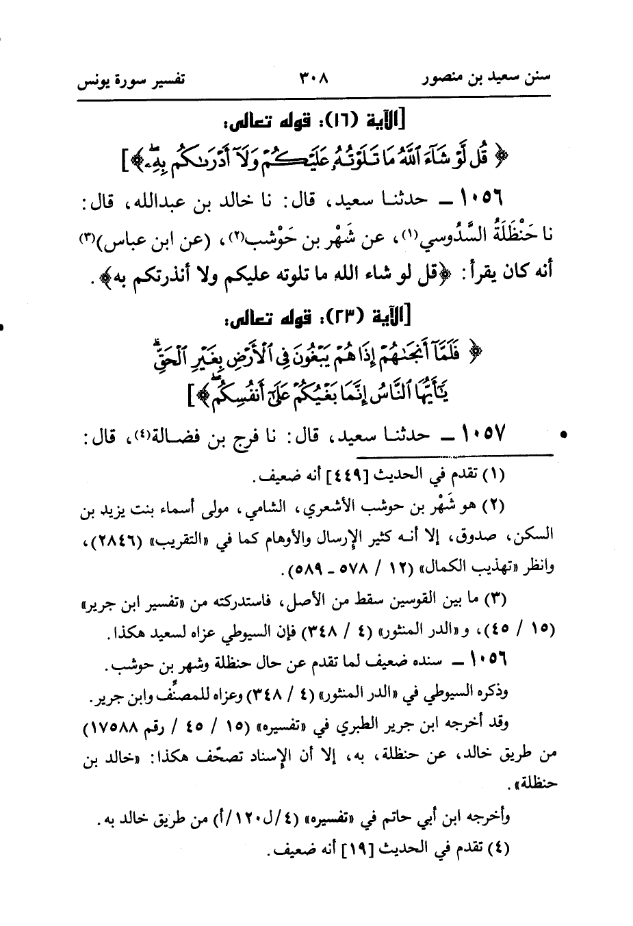 ١٠٥٦ - حَدَّثَنَا سَعِيدٌ، قَالَ: نا خَالِدُ بْنُ عَبْدِ اللَّهِ، قَالَ: نَا حَنْظَلَةُ السَّدُوسي (¬١)، عَنْ شَهْر بْنِ حَوْشب (¬٢)، (عَنِ ابْنِ عَبَّاسٍ) (¬٣)، أَنَّهُ كَانَ يَقْرَأُ: {قُلْ لَوْ شَاءَ اللَّهُ مَا تَلَوْتُهُ عَلَيْكُمْ وَلَا أَنْذَرْتُكُمْ بِهِ}.