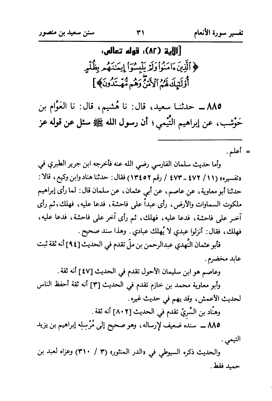 ٨٨٥- حَدَّثَنَا سَعِيدٌ، قَالَ: نا هُشيم، قَالَ: نا العَوَّام بْنُ حَوْشب، عَنْ إِبْرَاهِيمَ التَّيْمي؛ أَنَّ رَسُولَ - صَلَّى اللهُ عَلَيْهِ وَسَلَّمَ - سُئِلَ عن قوله عز