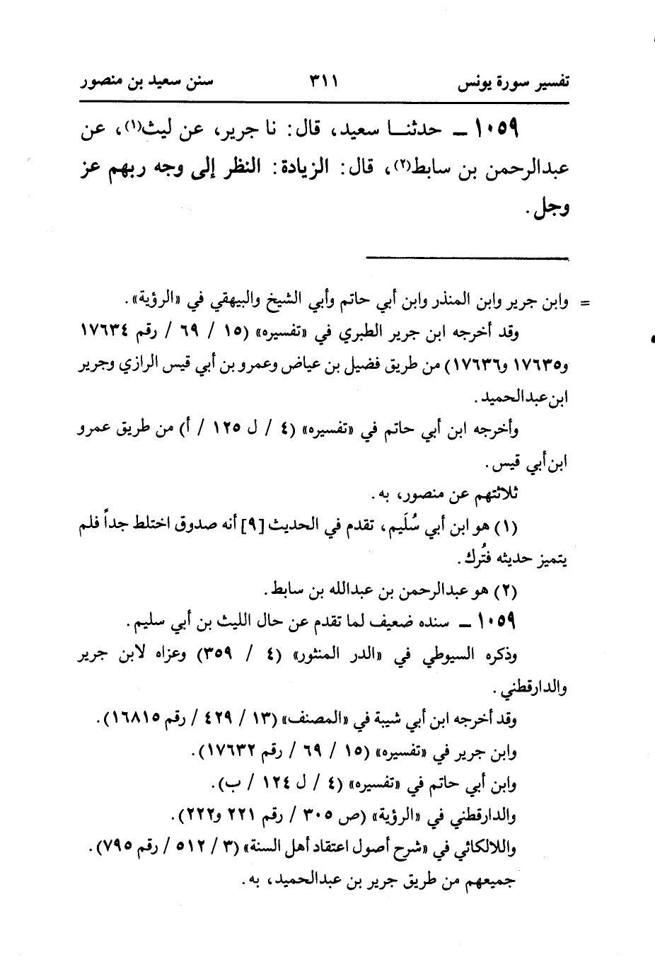 ١٠٥٩ - حَدَّثَنَا سَعِيدٌ، قَالَ: نا جَرِيرٌ، عَنْ لَيْثٍ (¬١)، عَنْ عَبْدِ الرَّحْمَنِ بْنِ سَابِطٍ (¬٢)، قَالَ: الزِّيَادَةُ: النَّظَرُ إِلَى وَجْهِ رَبِّهِمْ عَزَّ وَجَلَّ.
