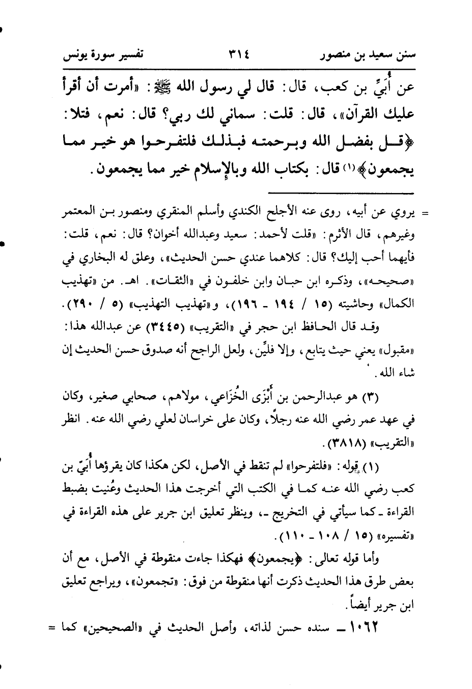عَنْ أُبَيِّ بْنِ كَعْبٍ، قَالَ: قَالَ لِي رَسُولُ اللَّهِ صَلَّى اللهُ عَلَيْهِ وَسَلَّمَ: ((أُمِرْتُ أَنْ أَقْرَأَ عَلَيْكَ الْقُرْآنَ))، قَالَ: قُلْتُ: سَمَّانِي لَكَ رَبِّي؟ قَالَ: نَعَمْ، فَتَلَا: {قُلْ بِفَضْلِ اللهِ وَبِرَحْمَتِهِ فَبِذَلِكَ فَلْيَفْرَحُوا هُوَ خَيْرٌ مِمَّا يَجْمَعُونَ} (¬١) قَالَ: بِكِتَابِ اللَّهِ وَبِالْإِسْلَامِ خَيْرٌ مما يجمعون.