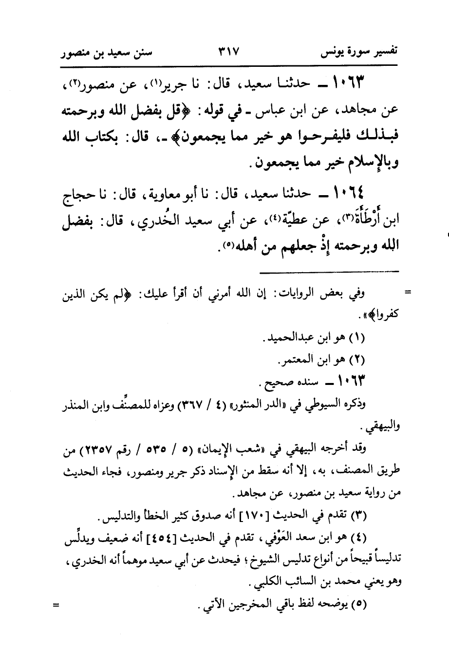 ١٠٦٣ - حَدَّثَنَا سَعِيدٌ، قَالَ: نا جَرِيرٌ (¬١)، عَنْ مَنْصُورٍ (¬٢)، عَنْ مُجَاهِدٍ، عَنِ ابْنِ عَبَّاسٍ - فِي قَوْلِهِ: {قُلْ بِفَضْلِ اللهِ وَبِرَحْمَتِهِ فَبِذَلِكَ فَلْيَفْرَحُوا هُوَ خَيْرٌ مِمَّا يَجْمَعُونَ} -، قَالَ: بِكِتَابِ اللَّهِ، وَبِالْإِسْلَامِ خَيْرٌ مِمَّا يَجْمَعُونَ.