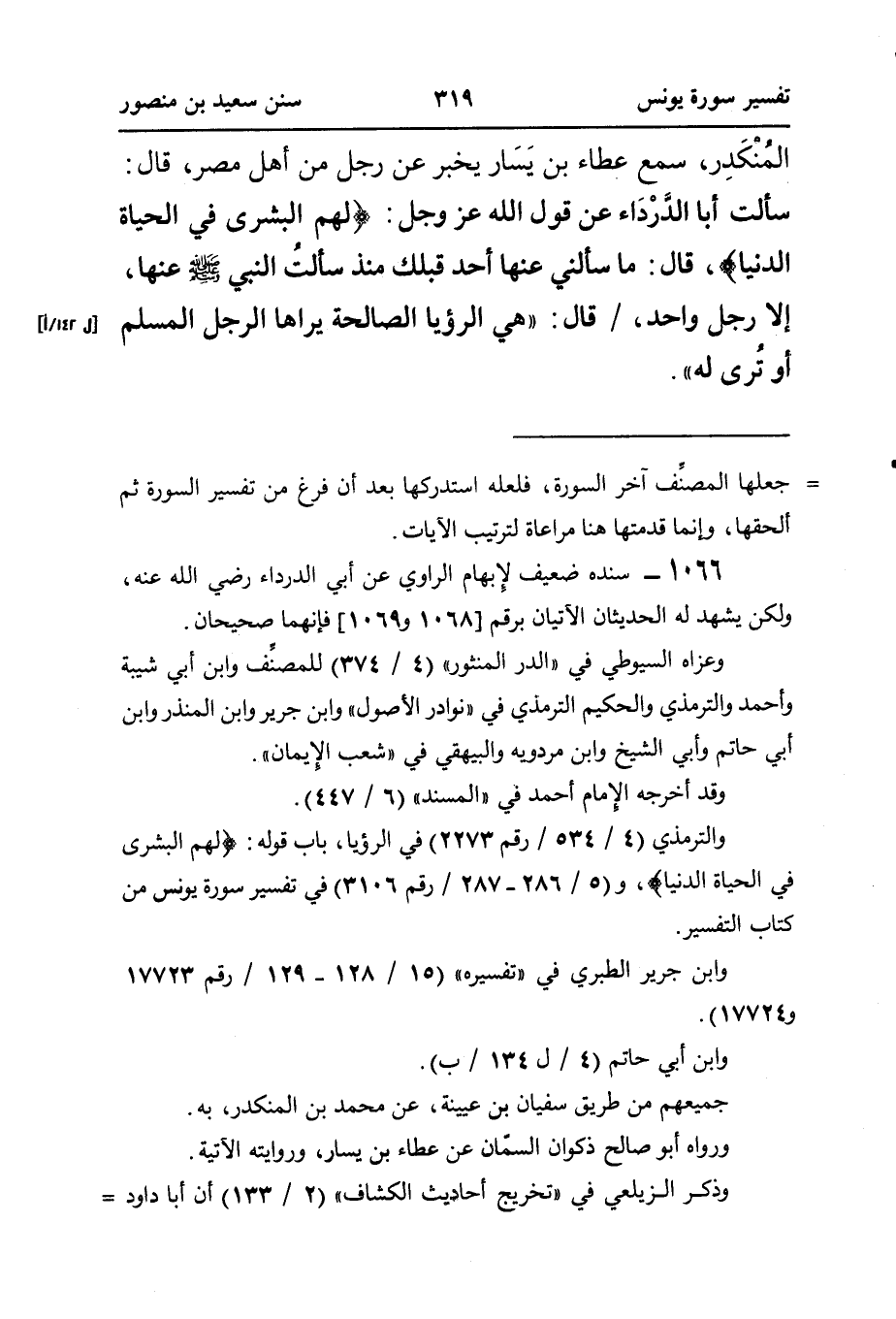 والترمذي (٤ / ٥٣٤ / رقم ٢٢٧٣) في الرؤيا، باب قوله: {لَهُمُ الْبُشْرَى فِي الْحَيَاةِ الدُّنْيَا} ، و (٥ / ٢٨٦ - ٢٨٧ / رقم ٣١٠٦) في تفسير سورة يونس من كتاب التفسير.