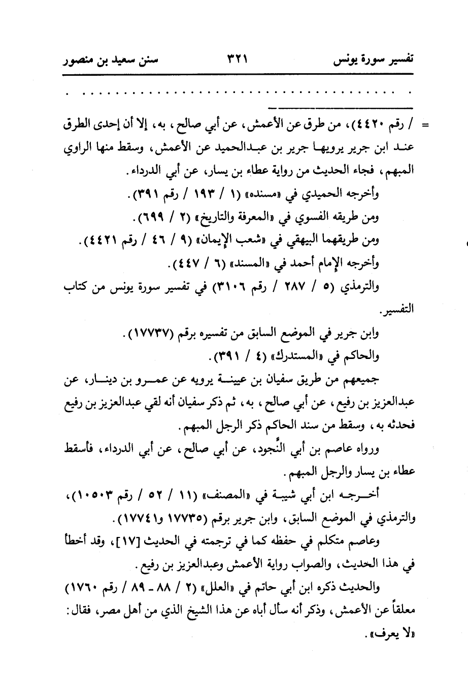 = رقم ٤٤٢٠) ، من طريق عَنِ الْأَعْمَشِ، عَنْ أَبِي صَالِحٍ، به، إلا أن إحدى الطرق عند ابن جرير يرويها جَرِيرُ بْنُ عَبْدِ الْحَمِيدِ عَنْ الأعمش، وسقط منها الراوي المبهم، فجاء الحديث من رواية عطاء بن يسار، عن أبي الدرداء.
