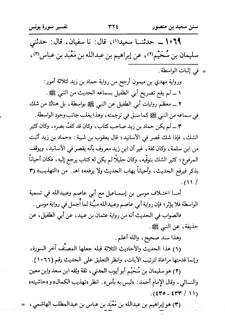 ١٠٦٩ - حَدَّثَنَا سَعِيدٌ (¬١)، قَالَ: نا سُفْيَانُ، قَالَ: حَدَّثَنِي سُلَيْمَانُ بْنُ سُحَيْم (¬٢)، عَنْ إِبْرَاهِيمَ بْنِ عَبْدِ اللَّهِ بن مَعْبَد بن عباس (¬٣)،