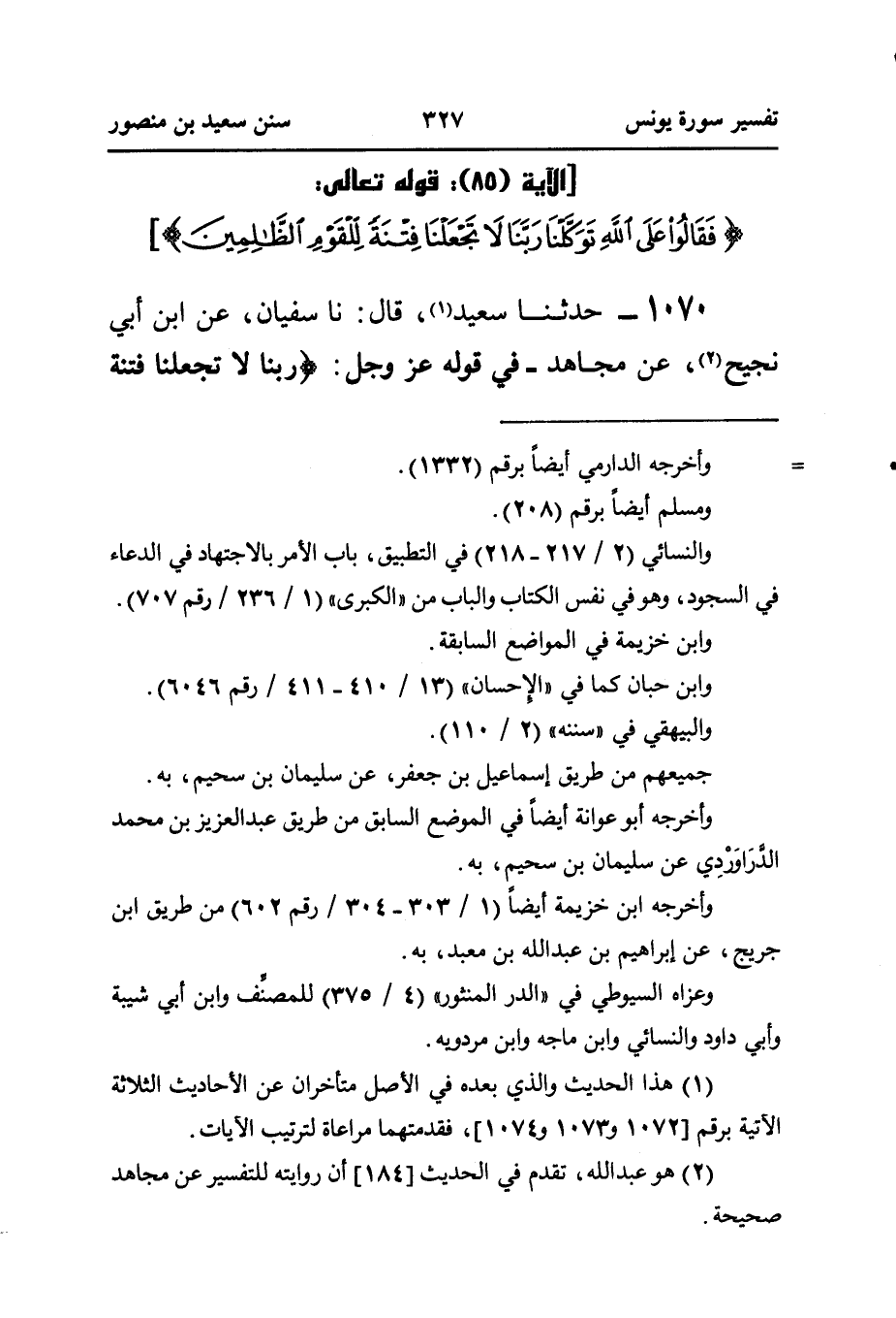 ١٠٧٠ - حَدَّثَنَا سَعِيدٌ (¬١)، قَالَ: نا سُفْيَانُ، عَنِ ابْنِ أَبِي نَجِيحٍ (¬٢)، عَنْ مُجَاهِدٍ - فِي قَوْلِهِ عَزَّ وَجَلَّ: {رَبَّنَا لَا تَجْعَلْنَا فِتْنَةً