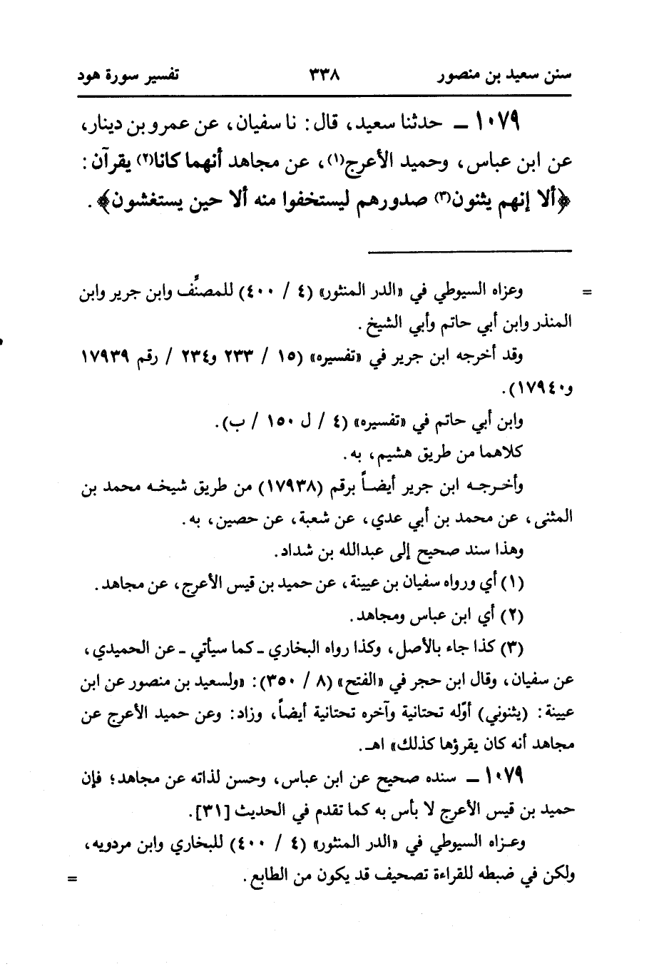 ١٠٧٩ - حَدَّثَنَا سَعِيدٌ، قَالَ: نا سُفْيَانُ، عَنْ عَمْرِو بْنِ دِينَارٍ، عَنْ ابْنِ عَبَّاسٍ، وَحُمَيْدٍ الْأَعْرَجِ (¬١)، عَنْ مُجَاهِدٍ أَنَّهُمَا كَانَا (¬٢) يَقْرَآنِ: {أَلَا إِنَّهُمْ يَثْنُونَ (¬٣) صُدُورَهُمْ لِيَسْتَخْفُوا مِنْهُ أَلَا حِينَ يَسْتَغْشُونَ}.