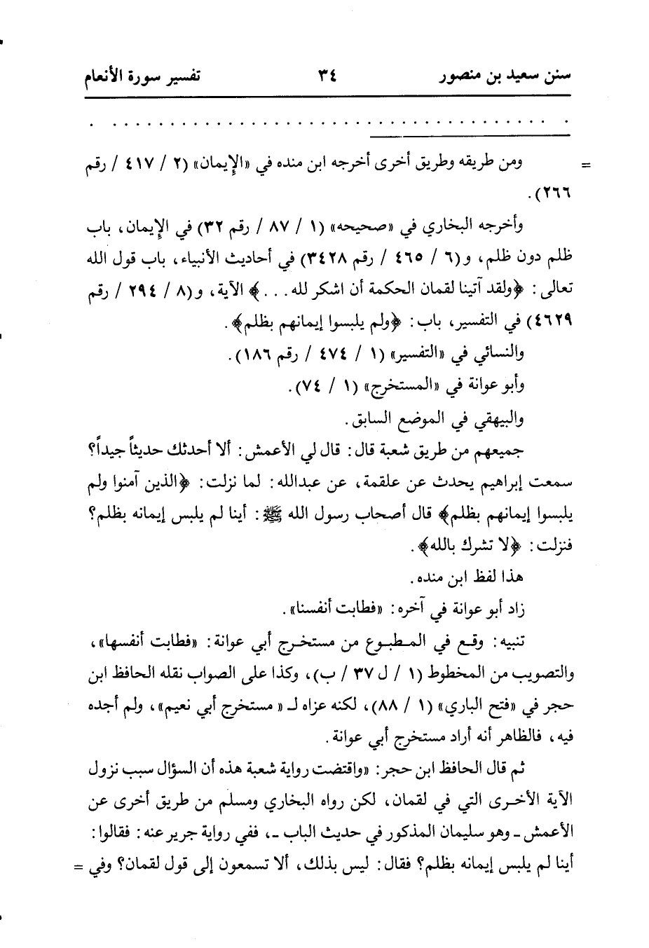 جميعهم من طريق شعبة قال: قال لي الأعمش: ألا أحدثك حديثًا جيدًا؟ سمعت إبراهيم يحدث عَنْ عَلْقَمَةَ، عَنْ عَبْدِ اللَّهِ: لَمَّا نَزَلَتِ: {الَّذِينَ آمَنُوا وَلَمْ يلبسوا إيمانهم بظلم} قال أَصْحَابُ رَسُولِ اللَّهِ - صَلَّى اللهُ عليه وسلم -: أينا لم يلبس إيمانه بظلم؟ فنزلت: {لا تشرك بالله} .
