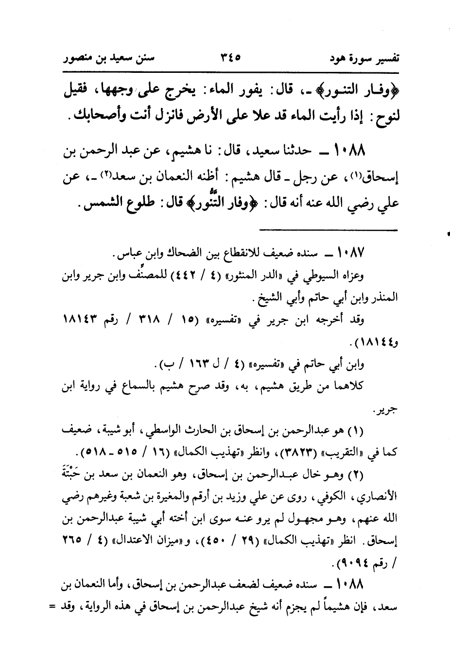 ١٠٨٨ - حَدَّثَنَا سَعِيدٌ، قَالَ: نَا هُشَيْمٌ، عَنْ عَبْدِ الرَّحْمَنِ بْنِ إِسْحَاقَ (¬١)، عَنْ رَجُلٍ - قَالَ هُشَيْمٌ: أَظُنُّهُ النُّعْمَانَ بْنَ سَعْدِ (¬٢) -، عَنْ عَلِيٍّ رَضِيَ اللَّهُ عَنْهُ أَنَّهُ قَالَ: {وَفَارَ التَّنُّور} قال: طلوع الشمس.