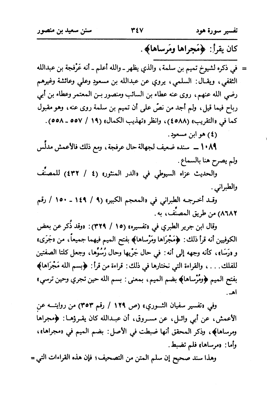 وفي ((تفسير سفيان الثوري)) (ص ١٢٩ رقم ٣٥٣) من روايته عن الأعمش، عَنْ أَبِي وَائِلٍ، عَنْ مَسْرُوقٍ، أن عبد الله كان يقرؤها: {مجراها ومراسها}، وذكر المحقق أنها ضبطت في الأصل: بضم الميم في ((مجراها))، وأما: ((مرساها)) فلم تضبط.