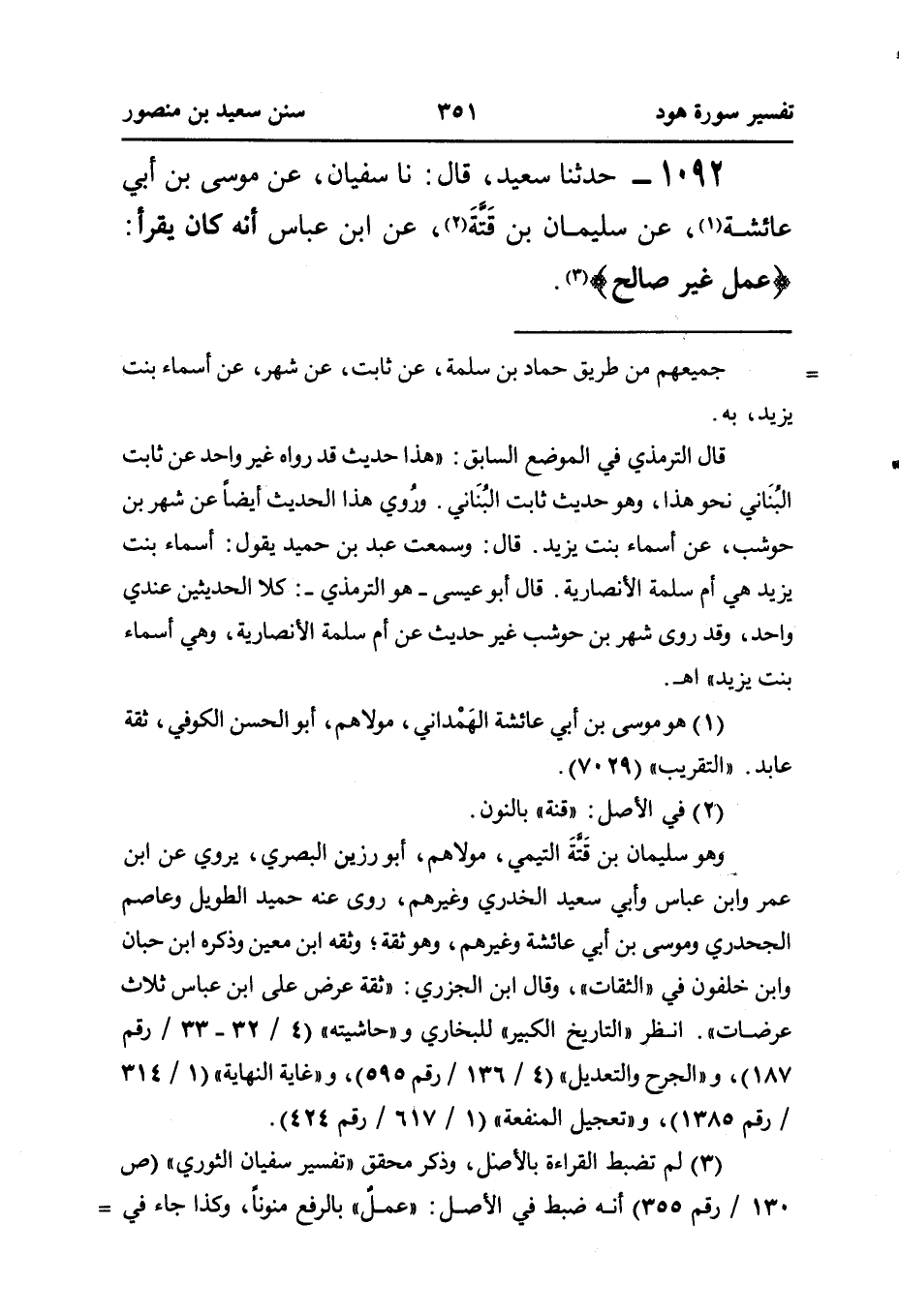 ١٠٩٢ - حَدَّثَنَا سَعِيدٌ، قَالَ: نا سُفْيَانُ، عَنْ مُوسَى بْنِ أَبِي عَائِشَةَ (¬١)، عَنْ سُلَيْمَانَ بْنِ قَتَّةَ (¬٢)، عَنِ ابْنِ عَبَّاسٍ، أَنَّهُ كَانَ يَقْرَأُ: {عمل غير صالح} (¬٣).
