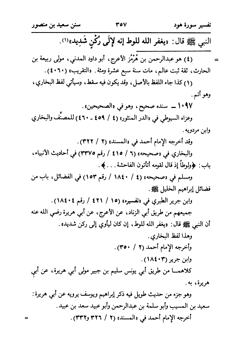 جميعهم من طريق أَبِي الزِّنَادِ، عَنِ الْأَعْرَجِ، عَنْ أبي هريرة رضي الله عنه أنَّ النَّبِيَ صَلَّى اللهُ عَلَيْهِ وَسَلَّمَ قَالَ: ((يَغْفِرُ اللَّهُ لِلُوطٍ، إن كان ليأوى إلى ركن شديد)).
