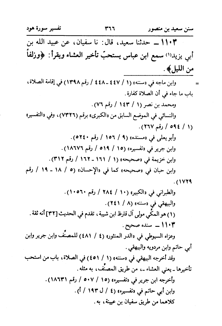 ١١٠٣ - حَدَّثَنَا سَعِيدٌ، قَالَ: نا سُفْيَانُ، عَنْ عُبَيْدِ اللَّهِ بْنِ أَبِي يَزِيدَ (¬١)، سَمِعَ ابْنَ عَبَّاسٍ يُسْتَحَبُّ تَأْخِيرُ الْعِشَاءِ وَيَقْرَأُ: {وَزُلَفًا مِنَ الليل}.