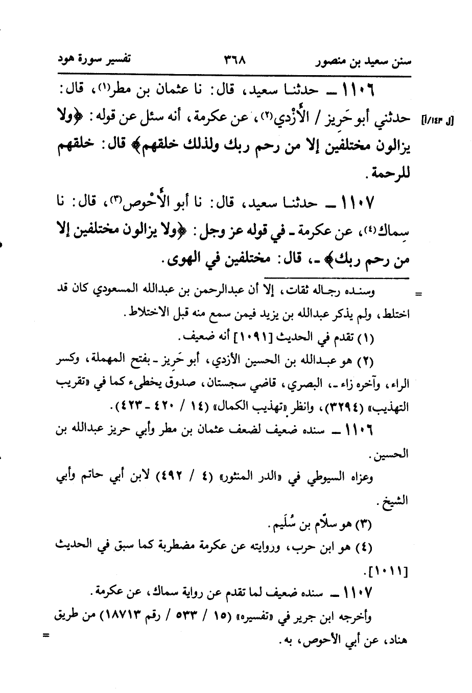 ١١٠٧ - حَدَّثَنَا سَعِيدٌ، قَالَ: نا أَبُو الأَحْوص (¬٣)، قَالَ: نَا سِماك (¬٤)، عَنْ عِكْرِمَةَ - فِي قَوْلِهِ عَزَّ وَجَلَّ: {وَلَا يَزَالُونَ مُخْتَلِفِينَ. إِلَّا مَنْ رَحِمَ رَبُّكَ} - قال: مختلفين في الهوى.