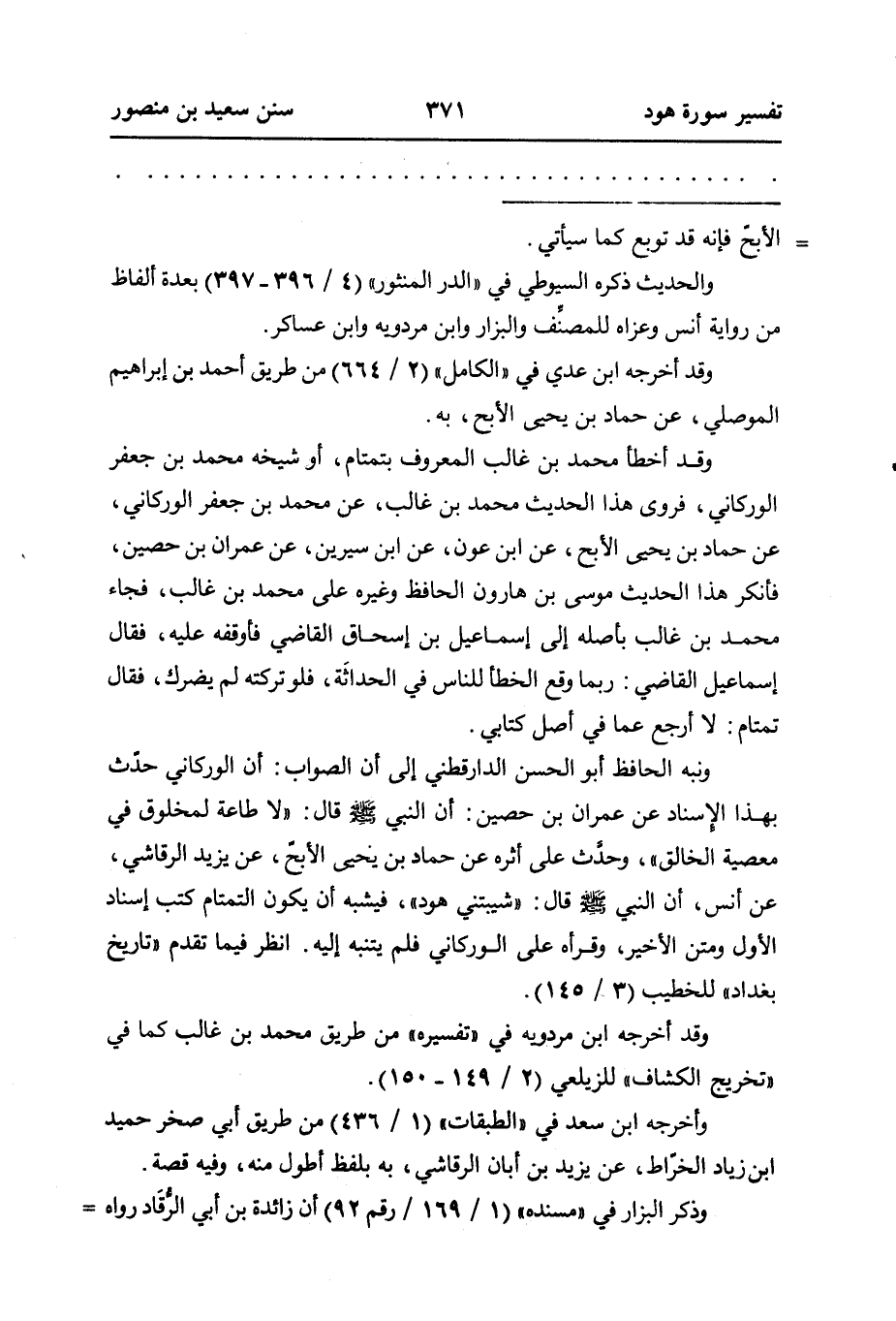 ونبه الحافظ أبو الحسن الدارقطني إلى أن الصواب: أن الوركاني حدّث بهذا الإسناد عن عمران بن حصين: أنَّ النَّبِيَ - صَلَّى اللهُ عَلَيْهِ وسلم - قال: ((لا طاعة لمخلوق في معصية الخالق)) ، وحدَّث على أثره عن حَمَّادُ بْنُ يَحْيَى الْأَبَحُّ، عَنْ يزيد الرقاشي، عن أنس، أنَّ النَّبِيَ - صَلَّى اللهُ عَلَيْهِ وسلم - قال: ((شيبتني هود)) ، فيشبه أن يكون التمتام كتب إسناد الأول ومتن الأخير، وقرأه على الوركاني فلم يتنبه إليه. انظر فيما تقدم ((تاريخ بغداد)) للخطيب (٣ / ١٤٥) .
