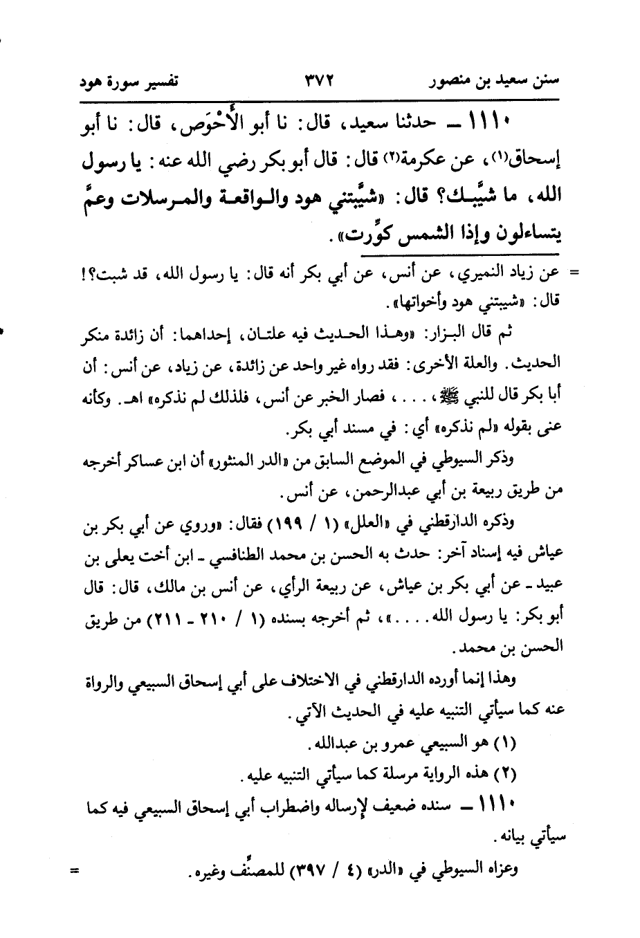 ١١١٠ - حَدَّثَنَا سَعِيدٌ، قَالَ: نا أَبُو الأَحْوَص، قَالَ: نَا أَبُو إِسْحَاقَ (¬١)، عَنْ عِكْرِمَةَ (¬٢)، قَالَ: قَالَ أَبُو بَكْرٍ رَضِيَ اللَّهُ عَنْهُ: يَا رَسُولَ اللَّهِ، مَا شيَّبك؟ قَالَ: ((شيَّبتني هُودٌ وَالْوَاقِعَةُ وَالْمُرْسَلَاتُ وعمَّ يتساءلون وإذا الشمس كوِّرت)).