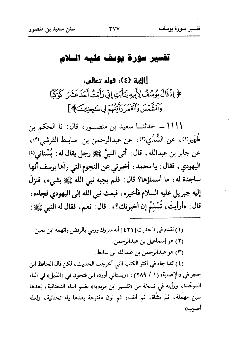 ١١١١ - حَدَّثَنَا سَعِيدُ بْنُ مَنْصُورٍ، قَالَ: نَا الْحَكَمُ بْنُ ظُهَير (¬١)، عَنِ السُّدِّي (¬٢)، عَنْ عَبْدِ الرَّحْمَنِ بْنِ سَابِطٍ الْقُرَشِيِّ (¬٣)، عَنْ جَابِرِ بْنِ عَبْدِ اللَّهِ، قَالَ: أَتَى النبيَّ صَلَّى اللهُ عَلَيْهِ وَسَلَّمَ رَجُلٌ يُقَالُ لَهُ: بُسْتاني (¬٤) الْيَهُودِيِّ، فَقَالَ: يَا مُحَمَّدُ، أَخْبِرْنِي عَنِ النُّجُومِ الَّتِي رَآهَا يُوسُفُ أَنَّهَا سَاجِدَةٌ لَهُ، مَا أَسْمَاؤُهَا؟ قَالَ: فَلَمْ يُجِبْهُ نَبِيُّ اللَّهِ صَلَّى اللهُ عَلَيْهِ وَسَلَّمَ بِشَيْءٍ، فنزلَ إِلَيْهِ جِبْرِيلُ عَلَيْهِ السَّلَامُ فَأَخْبَرَهُ، فَبَعَثَ نَبِيُّ اللَّهِ إِلَى الْيَهُودِيِّ فَجَاءَهُ، قَالَ: ((أرأيتَ، تُسْلِمُ إِنْ أَخْبَرْتُكَ؟)). قَالَ: نَعَمْ، فَقَالَ لَهُ النَّبِيُّ صلى الله عليه وسلم: