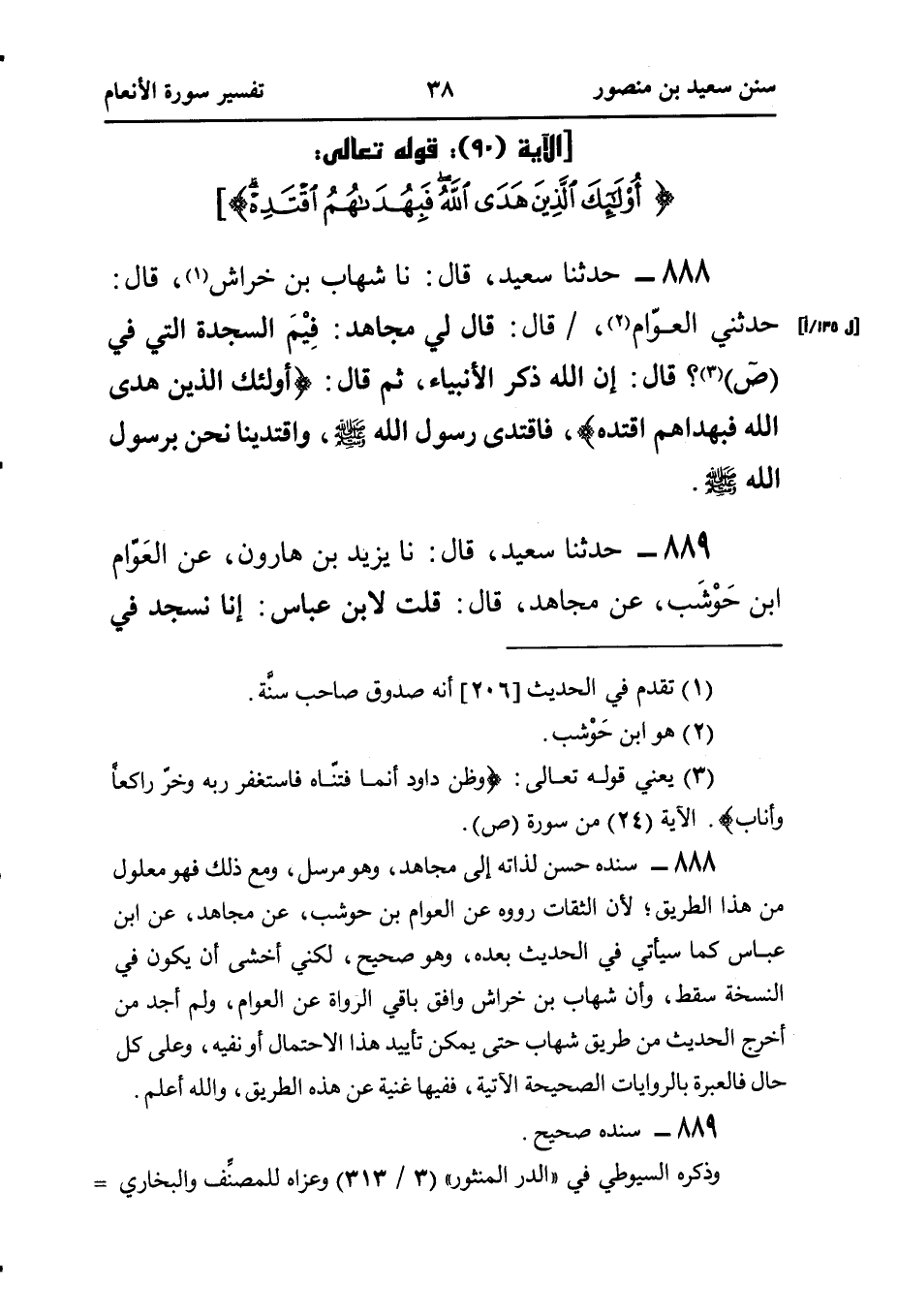 ٨٨٨ - حَدَّثَنَا سَعِيدٌ، قَالَ: نا شِهَابُ بْنُ خِرَاشٍ (¬١)، قَالَ: حَدَّثَنِي الْعَوَّامُ (¬٢)، [ل ١٣٥/أ] قَالَ: قَالَ لِي مُجَاهِدٌ: فِيْمَ السَّجْدَةُ الَّتِي فِي (ص) (¬٣)؟ قَالَ: إِنَّ اللَّهَ ذَكَرَ الْأَنْبِيَاءَ، ثُمَّ قَالَ: {أُولَئِكَ الَّذِينَ هَدَى اللهُ فَبِهُدَاهُمُ اقْتَدِهِ}، فَاقْتَدَى رَسُولُ اللَّهِ - صَلَّى اللهُ عَلَيْهِ وَسَلَّمَ -، وَاقْتَدَيْنَا نَحْنُ بِرَسُولِ اللَّهِ - صَلَّى اللهُ عَلَيْهِ وَسَلَّمَ -.
