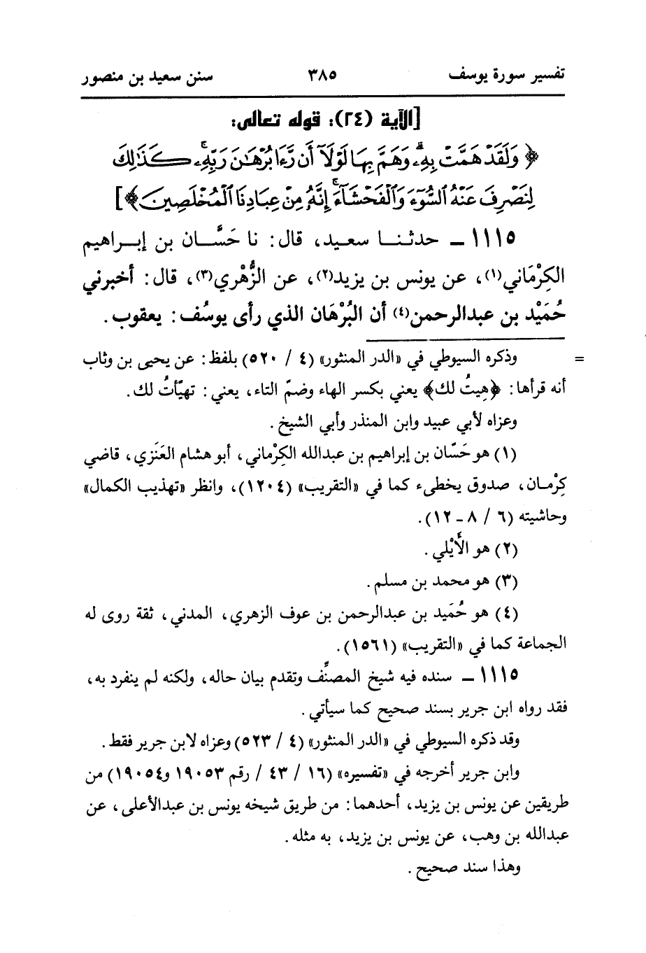 ١١١٥ - حَدَّثَنَا سَعِيدٌ، قَالَ: نَا حَسَّان بْنُ إِبْرَاهِيمَ الكِرْمَاني (¬١)، عَنْ يُونُسَ بْنِ يَزِيدَ (¬٢)، عَنِ الزُّهْري (¬٣)، قَالَ: أَخْبَرَنِي حُمَيْد بْنُ عَبْدِ الرَّحْمَنِ (¬٤)، أَنَّ البُرْهَان الَّذِي رَأَى يوسُف: يعقوب.