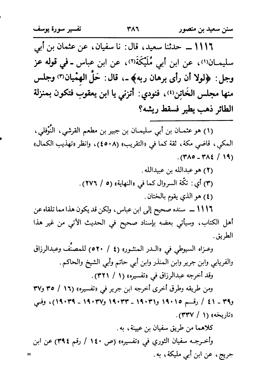 ١١١٦ - حَدَّثَنَا سَعِيدٌ، قَالَ: نا سُفْيَانُ، عَنْ عُثْمَانَ بْنِ أَبِي سُلَيْمَانَ (¬١)، عَنِ ابْنِ أَبِي مُلَيْكَةَ (¬٢)، عَنْ ابْنِ عَبَّاسٍ - فِي قَوْلِهِ عَزَّ وَجَلَّ: {لَوْلَا أَنْ رَأَى بُرْهَانَ رَبِّهِ} -، قَالَ: حَلَّ الهِمْيان (¬٣) وَجَلَسَ مِنْهَا مَجْلِسَ الخَاتِن (¬٤)، فَنُودِيَ: أَتَزْنِي يَا ابْنَ يَعْقُوبَ فَتَكُونُ بِمَنْزِلَةِ الطَّائِرِ ذهب يطير فسقط ريشه؟