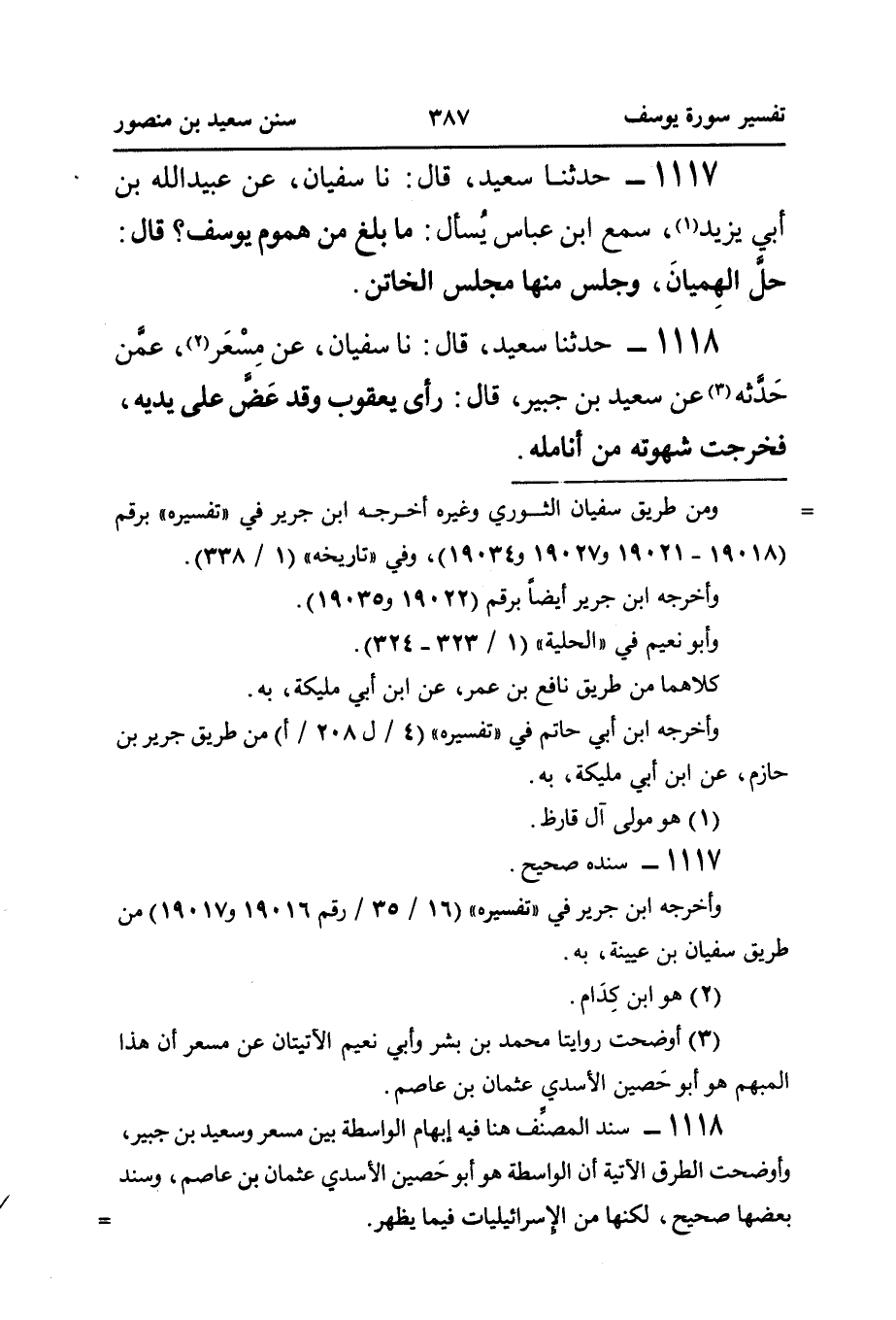 ١١١٨ - حَدَّثَنَا سَعِيدٌ، قَالَ: نَا سُفْيَانُ، عَنْ مِسْعَر (¬٢)، عمَّن حَدَّثه (¬٣) عَنْ سَعِيدِ بْنِ جُبَيْرٍ، قَالَ: رَأَى يَعْقُوبُ وَقَدَ عَضَّ عَلَى يَدَيْهِ، فَخَرَجَتْ شَهْوَتُهُ مِنْ أنامله.