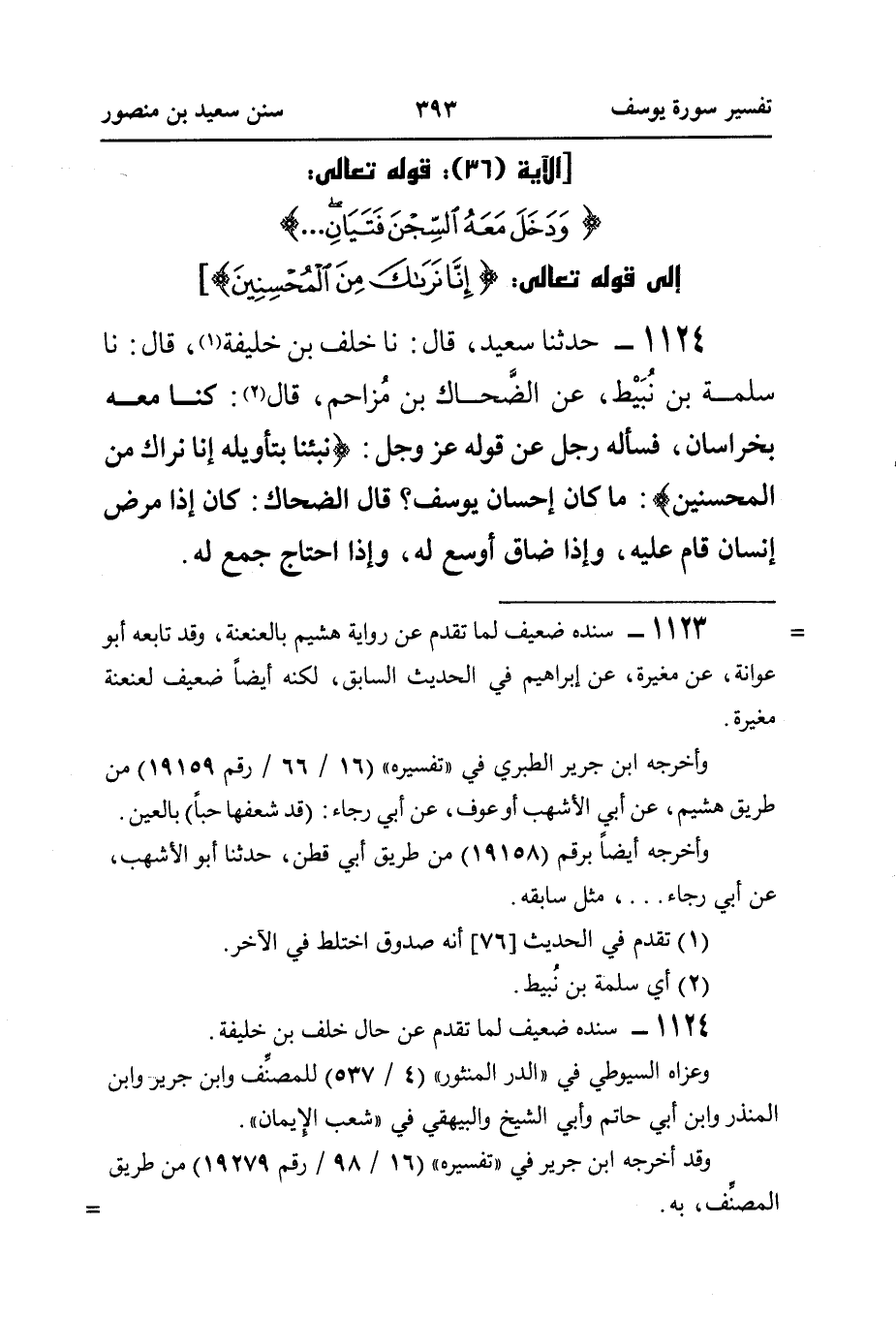 ١١٢٤ - حَدَّثَنَا سَعِيدٌ، قَالَ: نا خَلَفُ بْنُ خَلِيفَةَ (¬١)، قَالَ: نَا سَلَمَةُ بْنُ نُبَيْط، عَنِ الضَّحاك بْنِ مُزاحم، قَالَ (¬٢): كُنَّا مَعَهُ بِخُرَاسَانَ، فَسَأَلَهُ رَجُلٌ عَنْ قَوْلِهِ عَزَّ وَجَلَّ: {نَبِّئْنَا بِتَأْوِيلِهِ إِنَّا نَرَاكَ مِنَ المُحْسِنِينَ}: مَا كَانَ إِحْسَانُ يُوسُفَ؟ قَالَ الضَّحَّاكُ: كَانَ إِذَا مَرِضَ إِنْسَانٌ قَامَ عَلَيْهِ، وَإِذَا ضَاقَ أَوْسَعَ لَهُ، وَإِذَا احْتَاجَ جَمَعَ لَهُ.