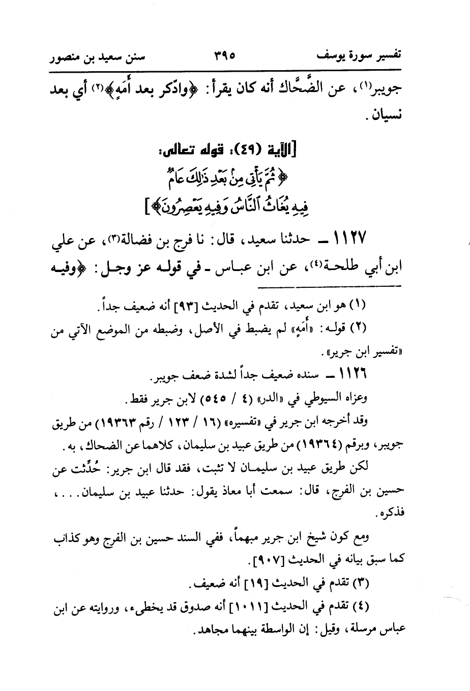 ١١٢٧ - حَدَّثَنَا سَعِيدٌ، قَالَ: نا فَرَجُ بْنُ فَضَالَةَ (¬٣)، عَنْ عَلِيِّ بْنِ أَبِي طَلْحَةَ (¬٤)، عَنِ ابْنِ عَبَّاسٍ - فِي قَوْلِهِ عَزَّ وَجَلَّ: {وَفِيهِ