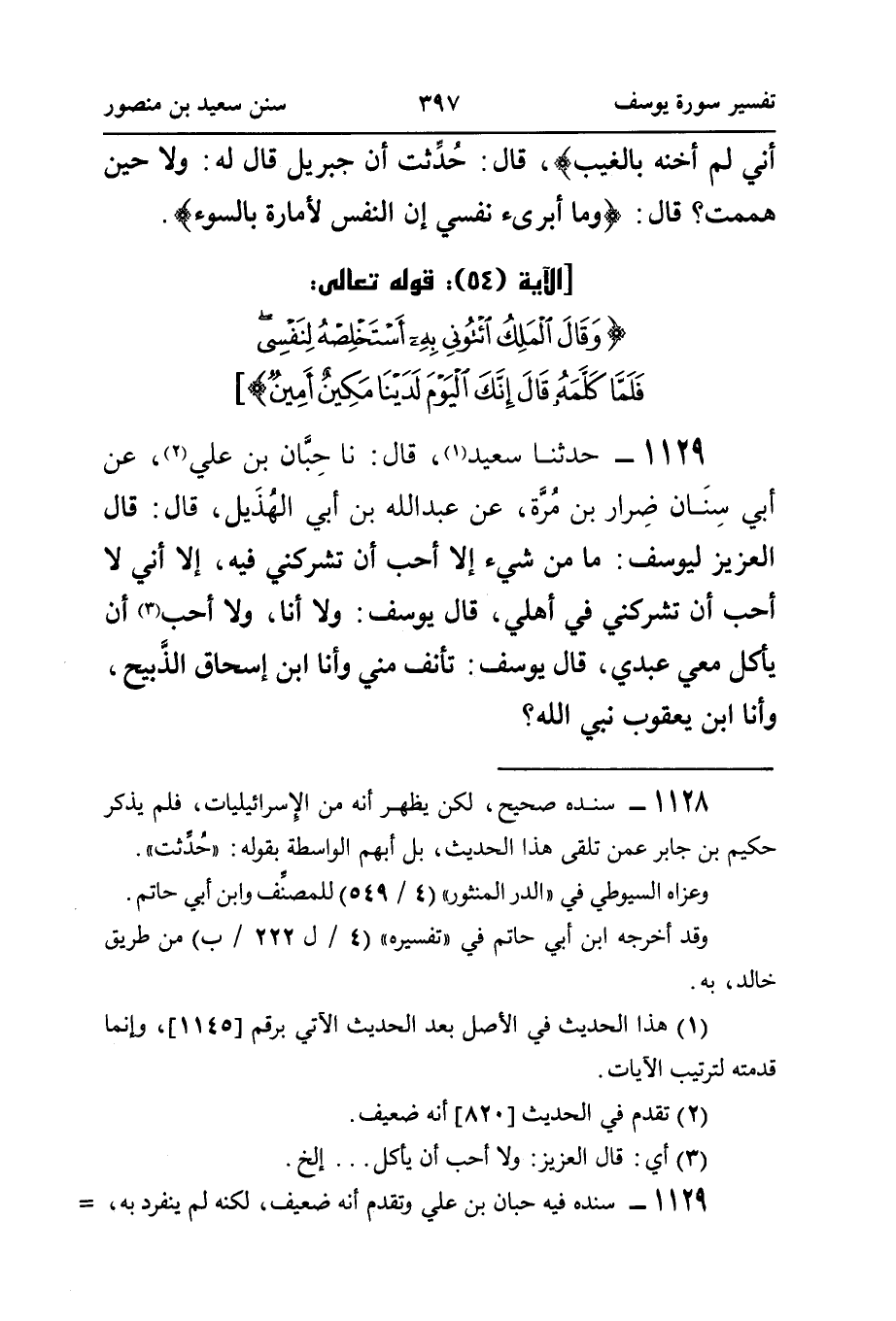 ١١٢٩ - حَدَّثَنَا سَعِيدٌ (¬١)، قَالَ: نا حِبَّان بْنُ عَلِيٍّ (¬٢)، عَنْ أَبِي سِنَان ضِرار بْنُ مُرَّة، عَنْ عَبْدِ اللَّهِ بْنِ أَبِي الهُذَيل، قَالَ: قَالَ الْعَزِيزُ لِيُوسُفَ: مَا مِنْ شَيْءٍ إِلَّا أُحِبُّ أَنْ تُشْرِكَنِي فِيهِ، إِلَّا أَنِّي لَا أُحِبُّ أَنْ تُشْرِكَنِي فِي أَهْلِي، قَالَ يُوسُفُ: وَلَا أَنَا، وَلَا أُحِبُّ (¬٣) أَنْ يَأْكُلَ مَعِي عَبْدِي، قَالَ يُوسُفُ: تَأْنَفُ مِنِّي وَأَنَا ابْنُ إِسْحَاقَ الذَّبيح، وَأَنَا ابْنُ يَعْقُوبَ نبي الله؟