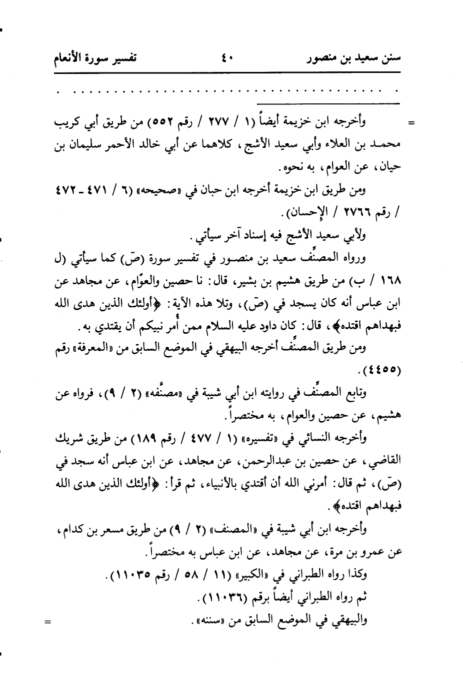 ورواه المصنَِّف سعيد بن منصور في تفسير سورة (ص) كما سيأتي (ل ١٦٨ / ب) من طريق هشيم بن بشير، قال: نا حصين والعوّام، عَنْ مُجَاهِدٍ عَنِ ابْنِ عَبَّاسٍ أنه كان يسجد في (ص) ، وتلا هذه الآية: {أُولَئِكَ الَّذِينَ هَدَى اللَّهُ فَبِهُدَاهُمُ اقتده} ، قال: كان داود عليه السلام ممن أُمر نَبِيُّكُمْ أَنْ يُقْتَدَى بِهِ.