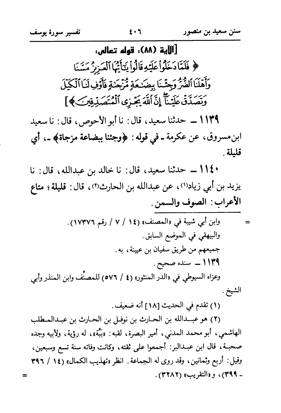 ١١٣٩ - حَدَّثَنَا سَعِيدٌ، قَالَ: نا أَبُو الْأَحْوَصِ، قَالَ: نَا سَعِيدُ بْنُ مَسْرُوقٍ، عَنْ عِكْرِمَةَ - فِي قَوْلِهِ: {وَجِئْنَا بِبِضَاعَةٍ مُزْجَاةٍ} -، أَيْ: قَلِيلَةٍ.