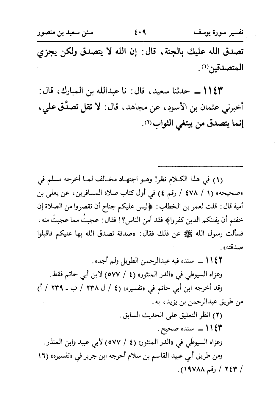 ١١٤٣ - حَدَّثَنَا سَعِيدٌ، قَالَ: نا عَبْدُ اللَّهِ بْنُ الْمُبَارَكِ، قَالَ: أَخْبَرَنِي عُثْمَانُ بْنُ الْأَسْوَدِ، عَنْ مُجَاهِدٍ، قَالَ: لَا تَقُلْ تصدَّق عَلَيَّ، إِنَّمَا يَتَصَدَّقُ مَنْ يبتغي الثواب (¬٢).
