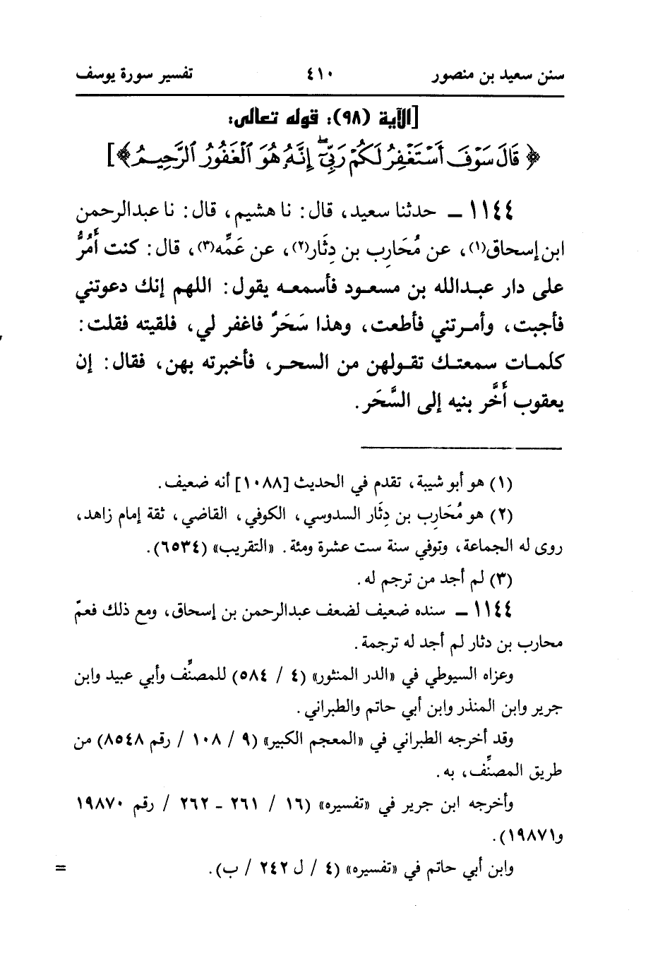 ١١٤٤ - حَدَّثَنَا سَعِيدٌ، قَالَ: نا هُشَيْمٌ، قَالَ: نا عَبْدُ الرَّحْمَنِ بْنُ إِسْحَاقَ (¬١)، عَنْ مُحَارِب بْنِ دِثَار (¬٢)، عَنْ عَمِّه (¬٣)، قَالَ: كُنْتُ أَمُرُّ عَلَى دَارِ عَبْدِ اللَّهِ بْنِ مَسْعُودٍ فَأَسْمَعُهُ يَقُولُ: اللَّهُمَّ إِنَّكَ دَعَوْتَنِي فَأَجَبْتُ، وَأَمَرَتْنِي فَأَطَعْتُ، وَهَذَا سَحَرٌ فَاغْفِرْ لِي، فَلَقِيتُهُ فَقُلْتُ: كَلِمَاتٍ سَمِعْتُكَ تَقُولُهُنَّ مِنَ السَّحَرِ، فَأَخْبَرْتُهُ بِهِنَّ، فَقَالَ: إِنَّ يَعْقُوبَ أَخَّر بنيه إلى السَّحَر.
