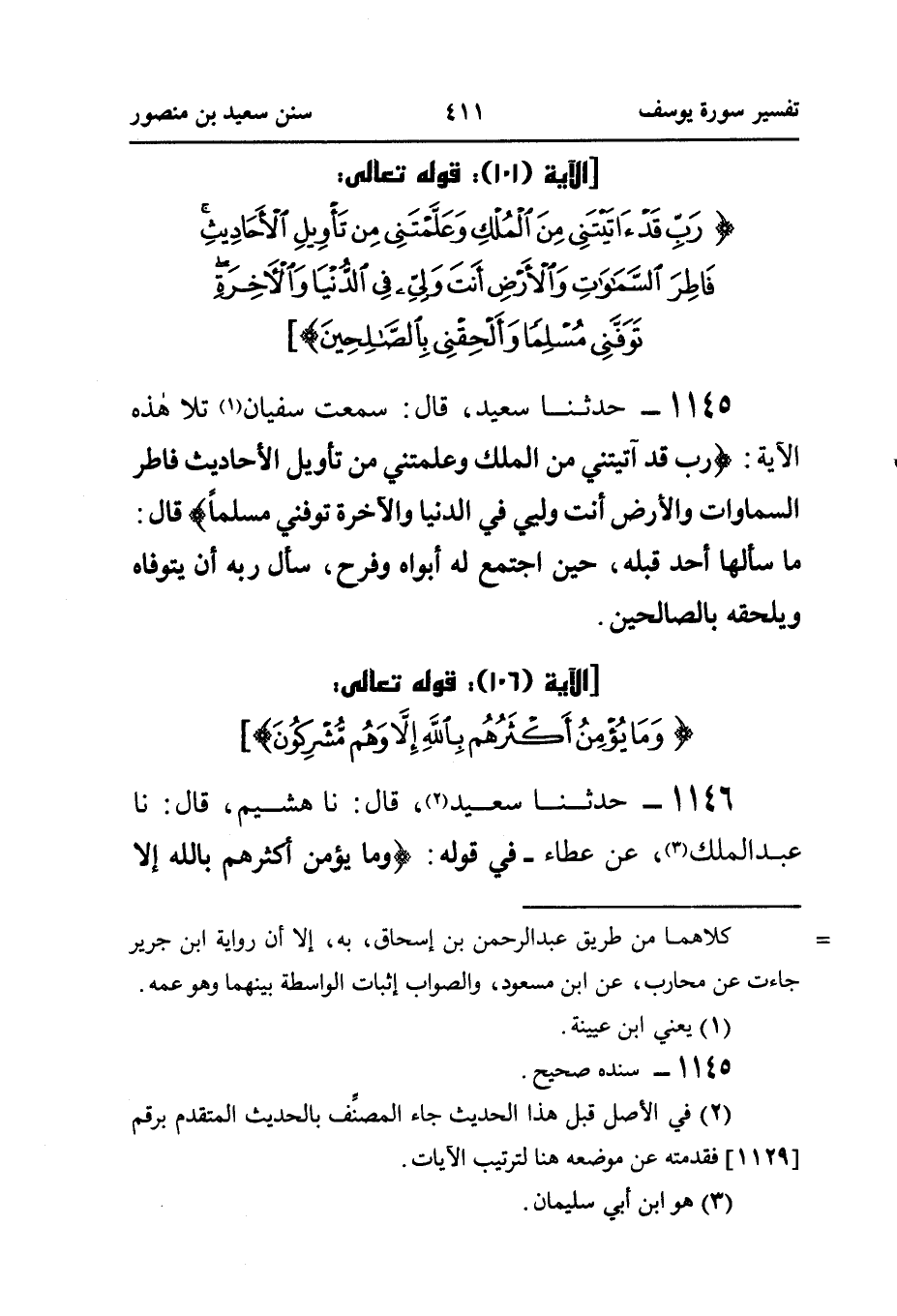 ١١٤٥ - حَدَّثَنَا سَعِيدٌ، قَالَ: سَمِعْتُ سُفْيَانَ (¬١) تَلَا هَذِهِ الْآيَةَ: {رَبِّ قَدْ آتَيْتَنِي مِنْ الْمُلْكِ وَعَلَّمْتَنِي مِنْ تَأْوِيلِ الأَحَادِيثِ فَاطِرَ السَّمَاوَاتِ وَالأَرْضِ أَنْتَ وَلِيِّ فِي الدُّنْيَا وَالآخِرَةِ تَوَفَّنِي مُسْلِماً} قَالَ: مَا سَأَلَهَا أَحَدٌ قَبْلَهُ، حِينَ اجْتَمَعَ لَهُ أَبَوَاهُ وَفَرِحَ، سَأَلَ رَبَّهُ أَنْ يَتَوَفَّاهُ وَيَلْحَقَهُ بِالصَّالِحِينَ.