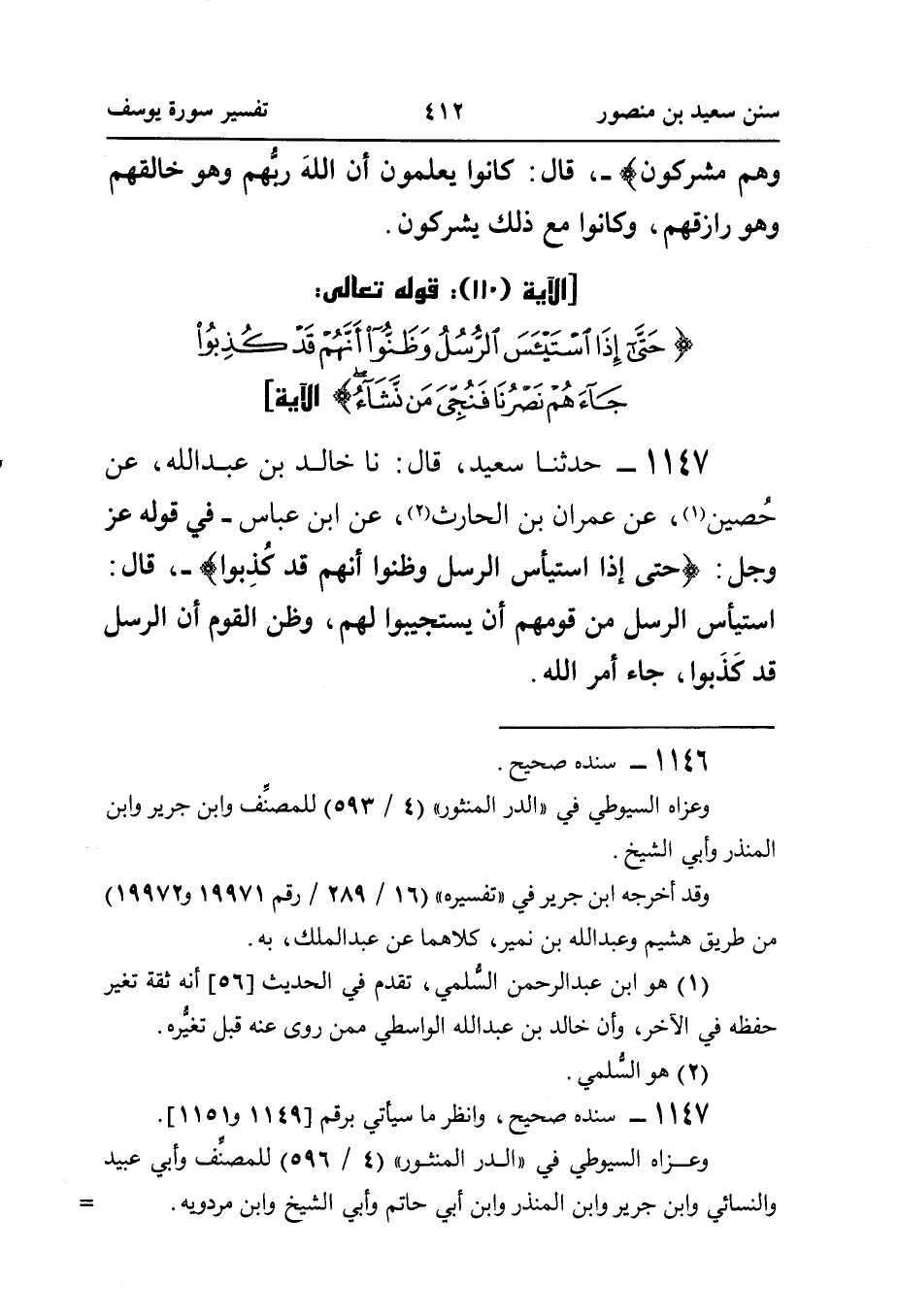١١٤٧ - حَدَّثَنَا سَعِيدٌ، قَالَ: نا خَالِدُ بْنُ عَبْدِ اللَّهِ، عَنْ حُصين (¬١)، عَنْ عِمْرَانَ بْنِ الْحَارِثِ (¬٢)، عَنِ ابْنِ عَبَّاسٍ - فِي قَوْلِهِ عز وجل: {حَتَّى إِذَا اسْتَيْئَسَ الرُّسُلُ وَظَنُّوا أَنَّهُمْ قَدْ كُذِبُوا} - قَالَ: اسْتَيْأَسَ الرُّسُلُ مِنْ قَوْمِهِمْ أَنْ يَسْتَجِيبُوا لَهُمْ، وَظَنَّ الْقَوْمُ أَنَّ الرُّسُلَ قَدْ كَذَبوا، جَاءَ أمر الله.